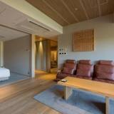 東館の客室一例。換気、照明、テレビ、Bluetoothスピーカー、床暖房など高機能な設備が充実しており、快適に寛げる。アルコールを含め、冷蔵庫のドリンクを無料で楽しめるのも嬉しい