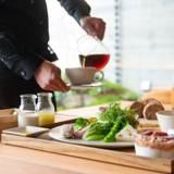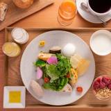 朝食は会場でどうぞ。前日の食べすぎ・呑みすぎのお腹に優しい野菜たっぷりの朝ごはん。大きなプレートにはサラダや卵が美しく盛り付けられこだわりを感じられます。パンやスープ、ドリンクも付いてボリュームも◎
