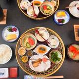 朝も1階のお食事処へ。丸籠に多彩なおかずをちょこちょこっと小鉢に盛った「朝籠膳」を楽しめます。地元の滋味を堪能。9室だけのこじんまりした宿ですので、お食事処でも落ち着いた雰囲気の中で食べられますよ。