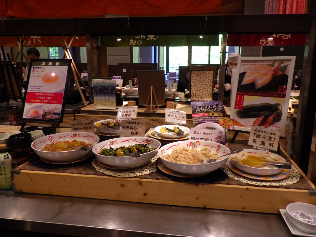 朝食と夕食はビュッフェ。仙台名物や東北の味など、地元の食材を使った料理が豊富。補充が追い付いていない料理も多く、作並元湯蒸し乳清豚地野菜を食べ損ねたのが残念。1 / 10