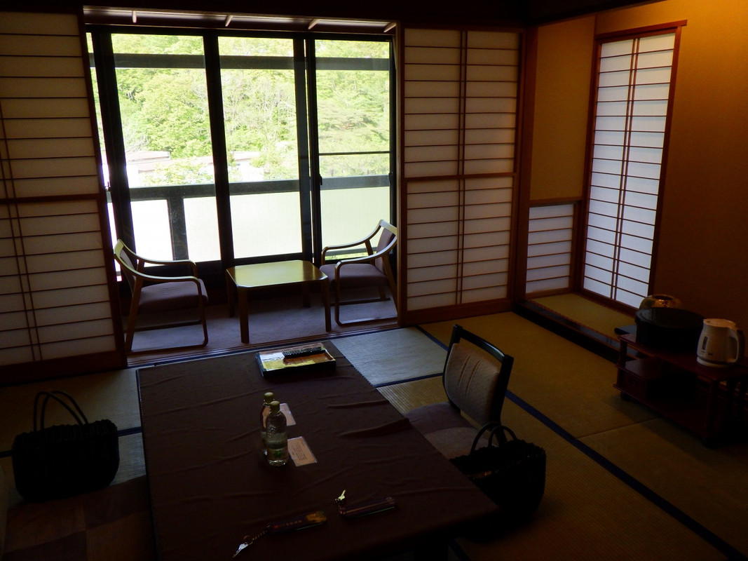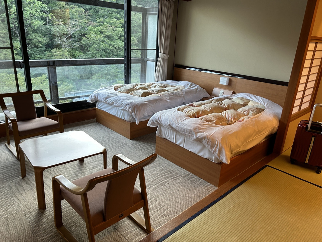 部屋のタイプは色々あり、和室10畳+4.5畳(ツインベッド)を予約。和洋室大好き。エアコンがイマイチで窓が開かなくて、湯上りは暑かったかな。