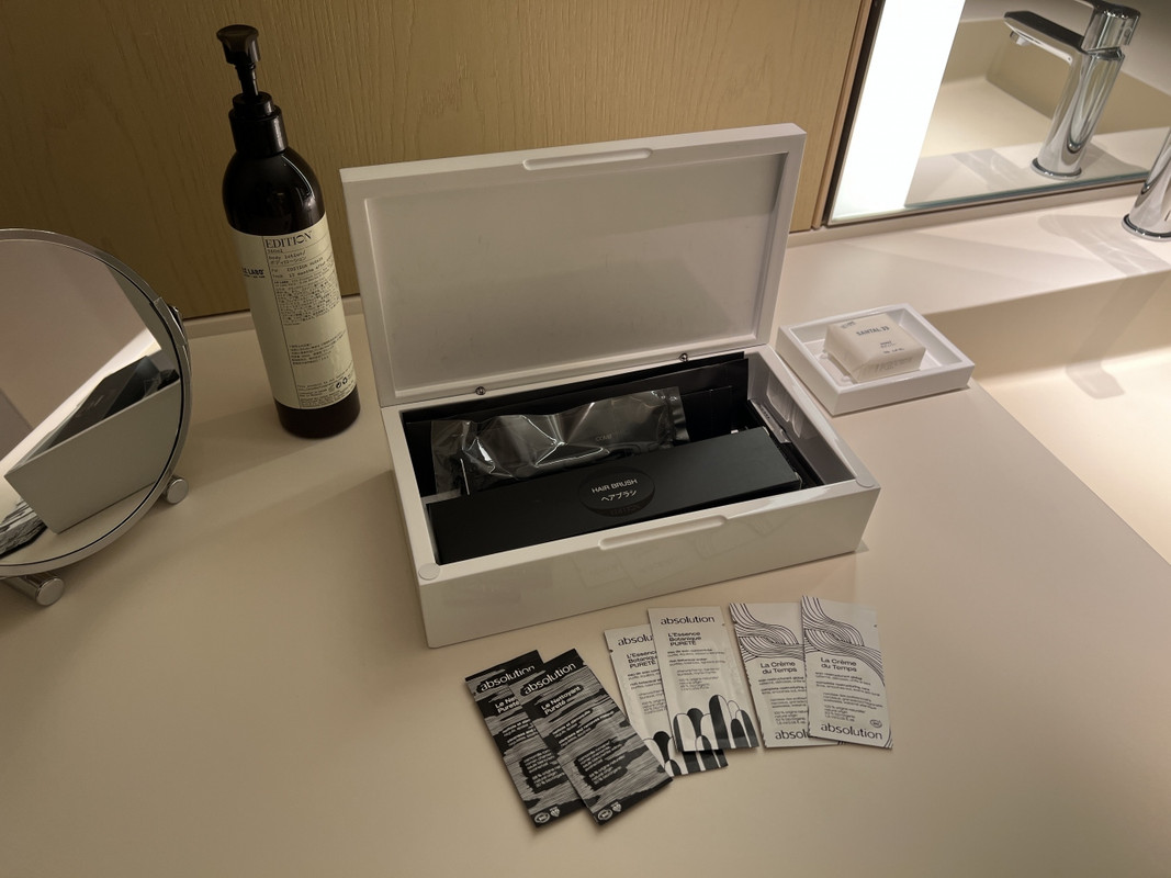アメニティはいまどきのホテルらしく、サステナブルを意識してカードキーやブラシ&歯ブラシは木製、トイレタリーもフランスのオーガニックブランド『absolution』のものでした。