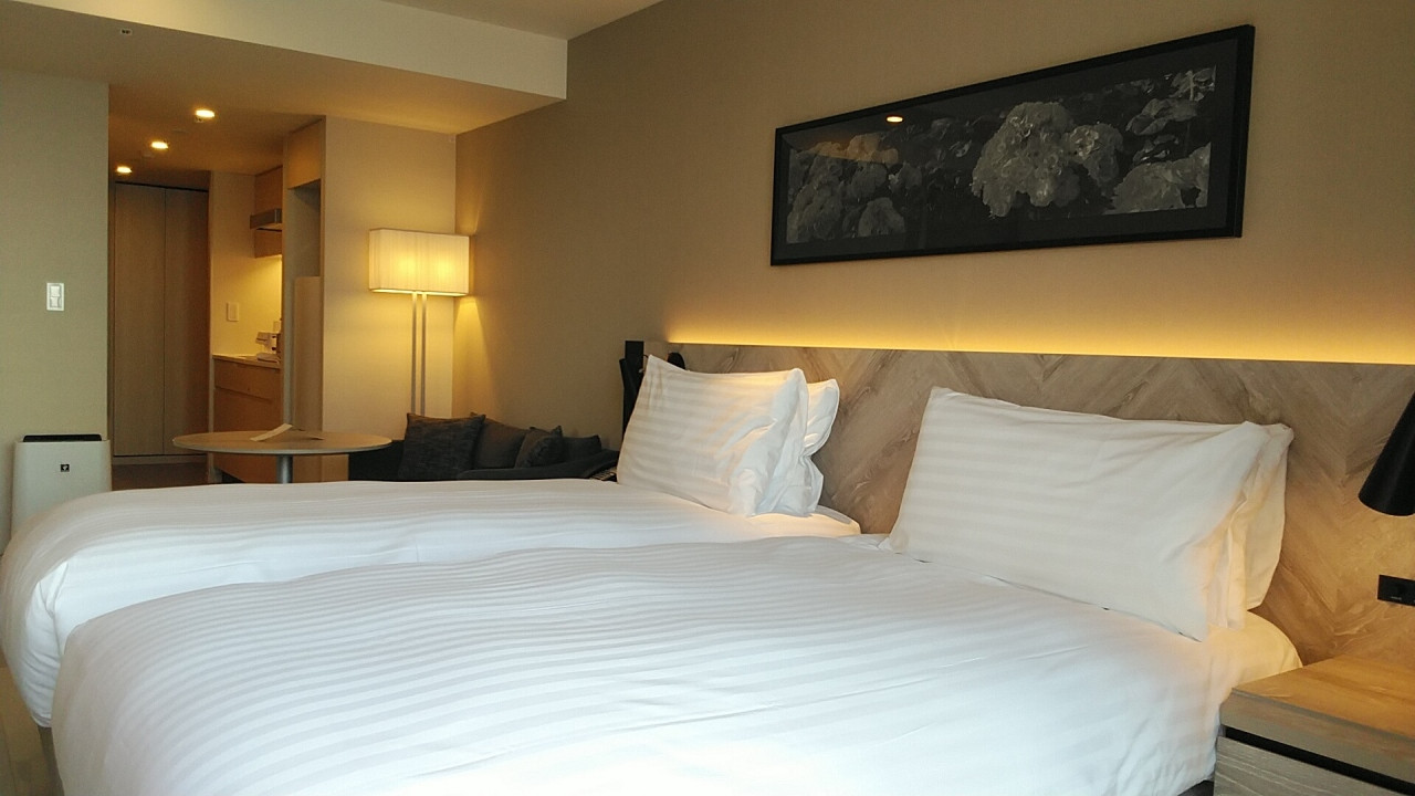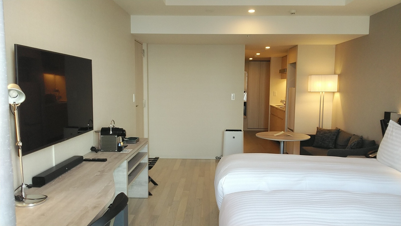 今回はじめての宿泊で一番スタンダードなスタジオ スーペリア ツイン【34㎡】を予約しました。部屋はランドマークタワー側の部屋でバルコニーもあり天気も良く窓を開けたまま過ごせて気持ちよかったですね!眺望はバルコニーからは夕日に照らされた富士山からランドマークタワー、みなとみらいの観覧車の夜景まで見えて新しい横浜の眺望を楽しめました。フロント46階は1周360℃の眺望が楽しめ日の出の時間に行くとベイブリッジに朝日も綺麗でお勧めです!部屋はデュベスタイルのベッドメイキングに加湿空気清浄機、自宅のように家電、カトラリーも充実で2泊共外食をしなくても部屋のキッチンで楽しめました。ホテル回りの散策スポットも多く楽しめ、自宅から電車1本でいけるのも便利でした。