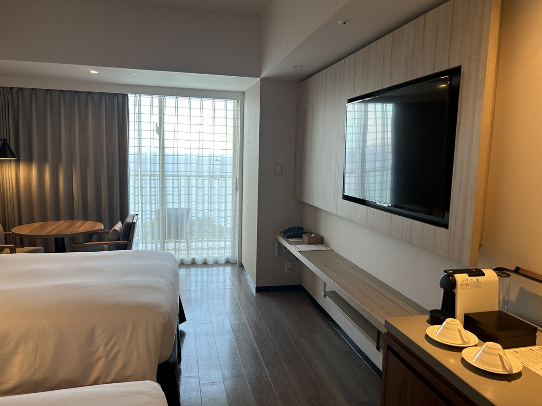 オーシャンビューのツインルームに宿泊。空と海の青さが鮮やかで見惚れました♡