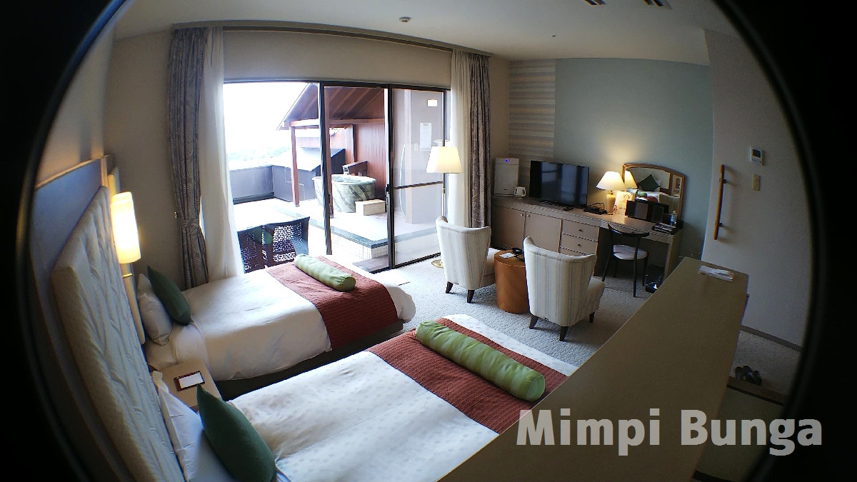 ベッド2台と和室がある広いお部屋と、広いバルコニーには温泉露天風呂が付いており、気ままに入れる贅沢な空間。