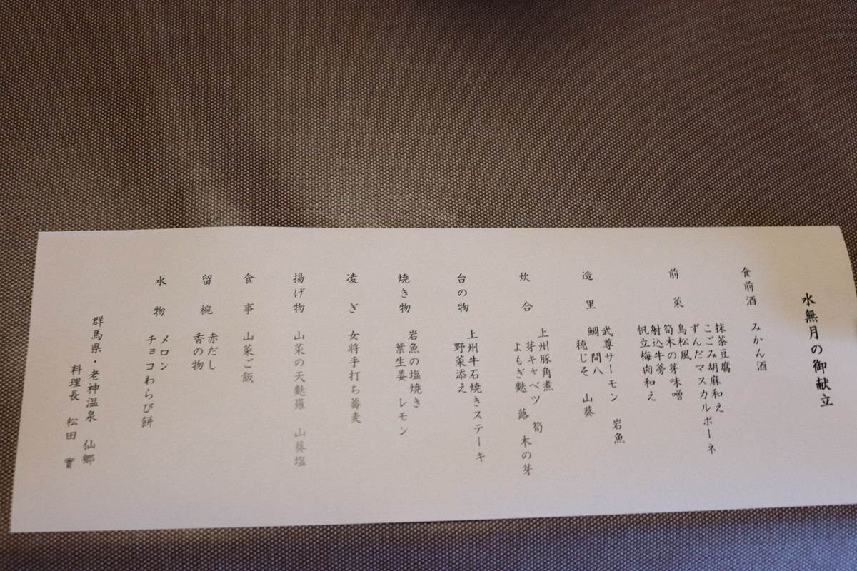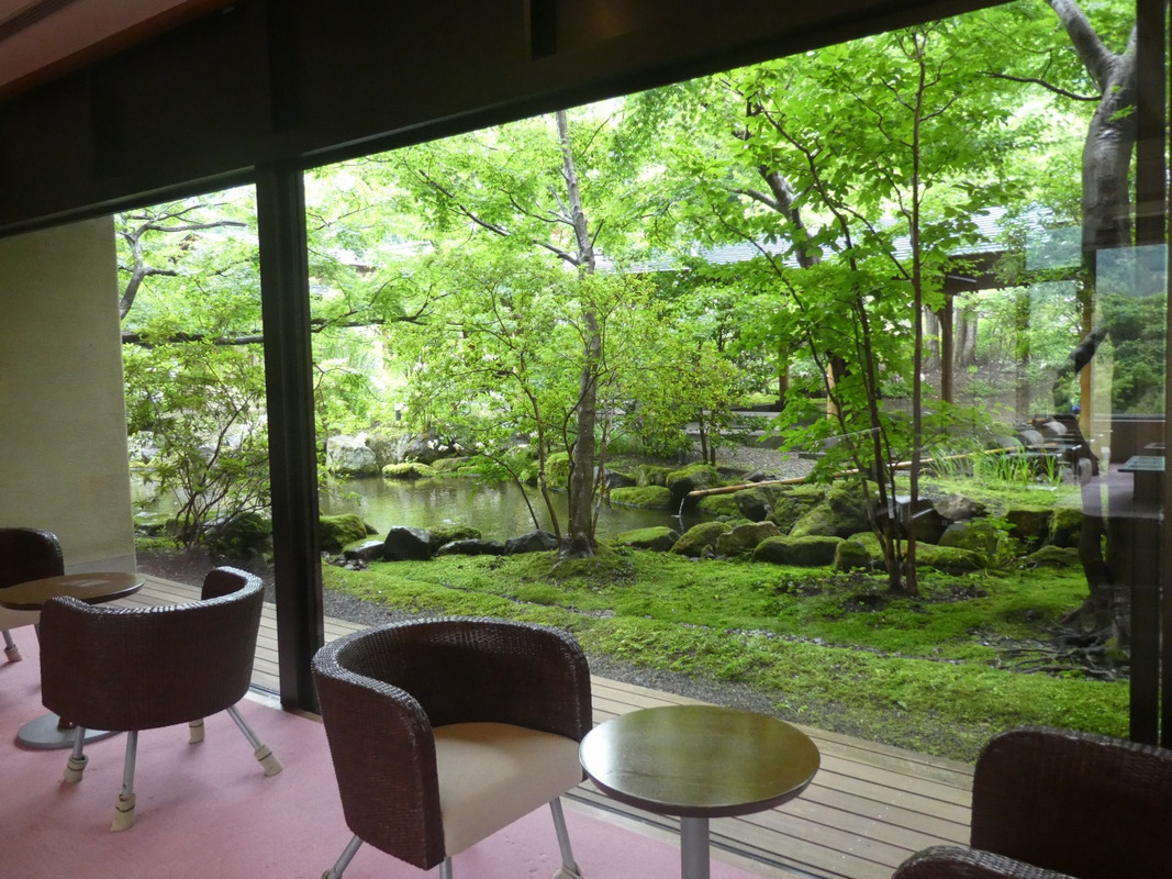 老神温泉の中心地から少し離れた山の中にあります。ロビーから見えるお庭がきれいですね。お部屋は特になにかの眺めがあるわけではありませんでしたが、窓一面に緑が広がり、清々しい感じがしました。お風呂も緑を眺めながらの入浴を楽しみましたが、上がってみたら体のあちこちに黒いものがついていました。石鹸でゴシゴシ洗わないと取れませんでしたが、どうやら石に座った際についてしまった汚れのようです。お掃除が必要かと。食事は大広間で、隣のテーブルとはかなりスペースが空いていました。夕食はどれも美味しくいただきましたが、感心したのはサーブのタイミング。ほぼ切れ目なく、次々と料理が運ばれてきました。仲居さんはゲストをよく見て動いていらっしゃるようです。朝食はチェックインの時に、和食か洋食か決めなければなりませんでした。それはいいのですが、和食はもう少し手を加えてあってもいいのでは? それに洋食を選んだ場合だけコーヒーが付くって‥。それなりの料金をお支払いしているつもりですが、お部屋の冷水ポットとか、食後のコーヒーのサービスくらいはあってもいいのではないでしょうか。