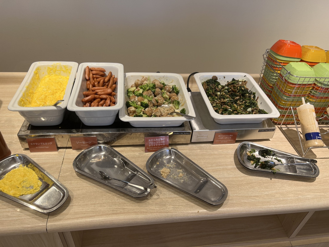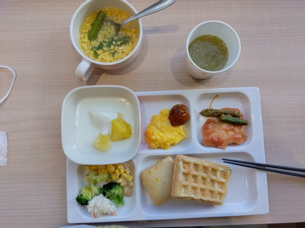 朝食は無料サービス。スムージーが売りのようです。この日は春限定のキーウィと小松菜?のグリーンのスムージーと、ベリーの入った赤紫色のスムージーの2種類でした。パンやワッフルとスープ、スクランブルエッグなど、洋食メインです。ご飯は炊き込みご飯のみ、味噌汁はありません。若い人向きの朝食のようですね。