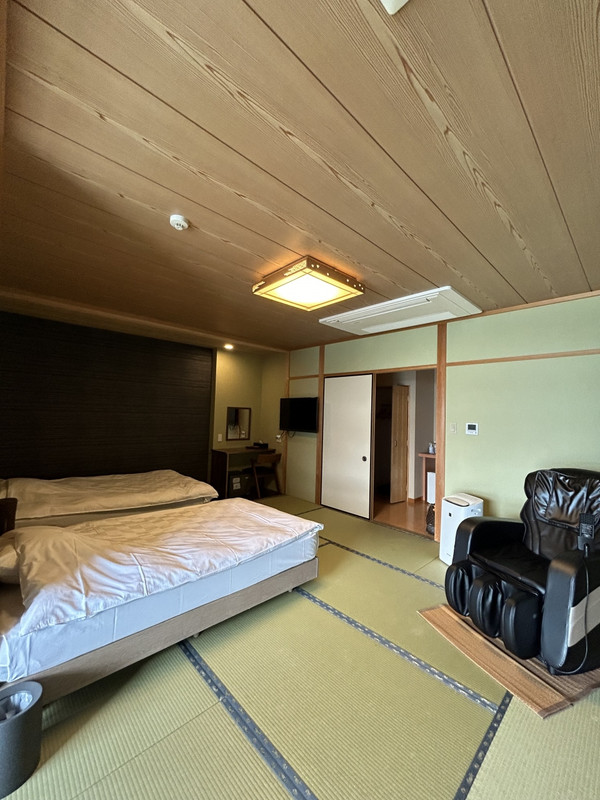 部屋にはマッサージチェアもあり、お風呂も快適。ソファではなく、掘りごたつでした。