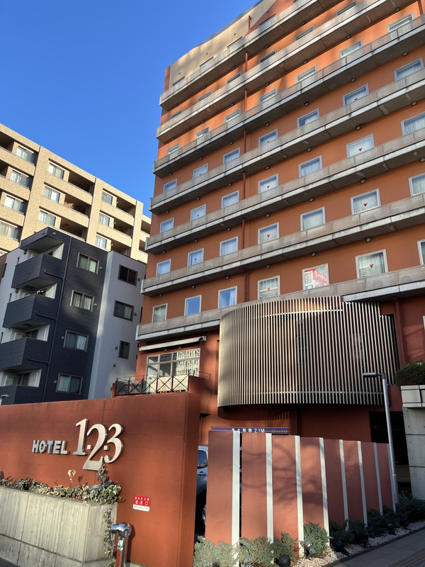このホテル1-2-3 高崎は高崎駅東口から北東の位置にあります。約5分弱にあります。高いマンション風の建物です。東口からのびる高架の通路から見れます。フロントは2階にあります。部屋でのWifiは弱くて有線で対応です。接続が旧式でのでノートPCでは接続用のものが必要です。