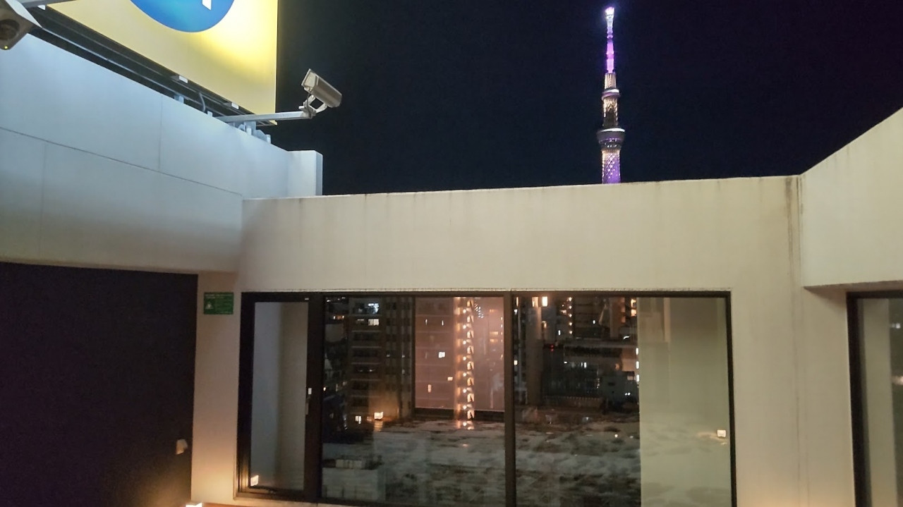 最上階には展望デッキがある。屋上をガラス張りにして立派にした感じで、目の前にスカイツリーが見える。