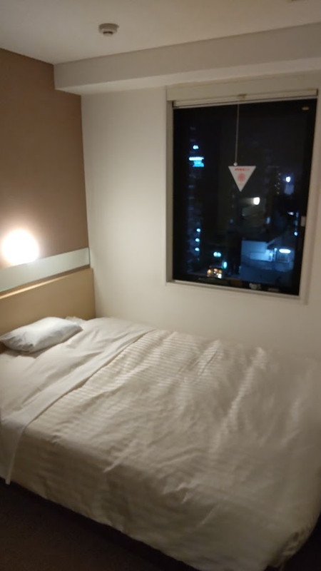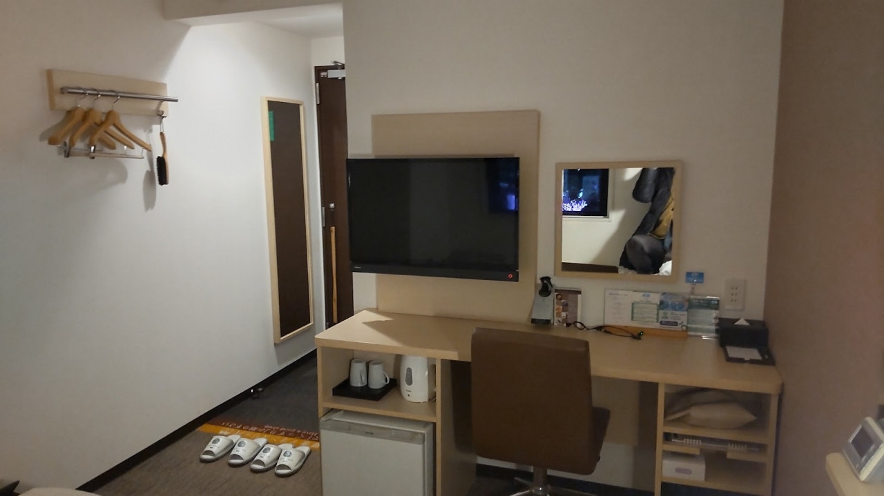 泊ったのはシングル。靴を脱いであがるスタイルの部屋で、奥にベット、手前にデスクという珍しい配置。窓からは駅方向の景色が見えた。