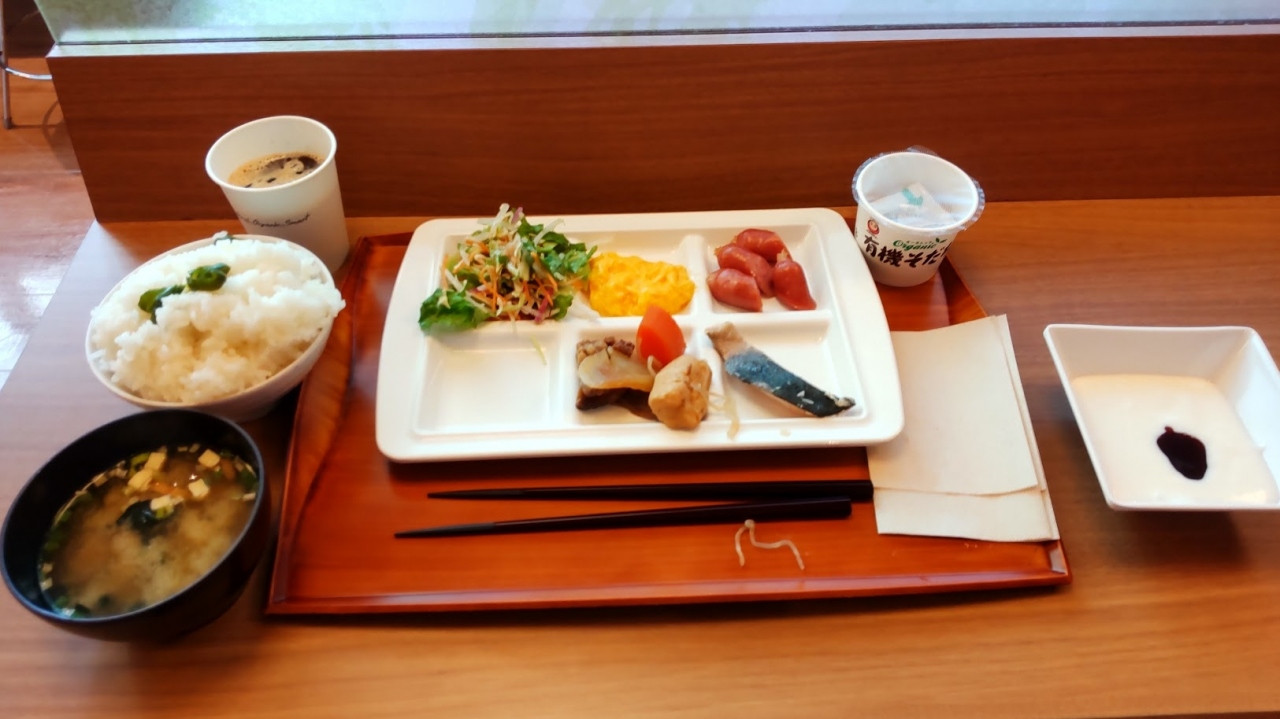 朝食は宿泊料に込み。終了10分前に行ったが、まずまずの品揃えで大満足。