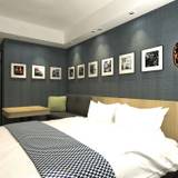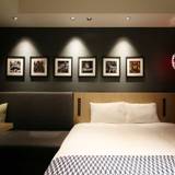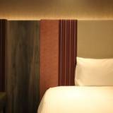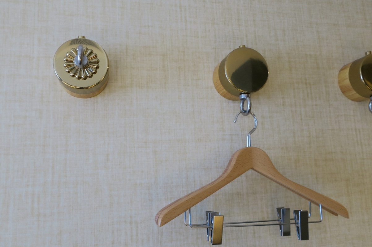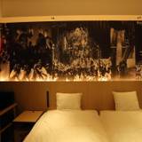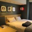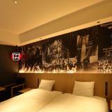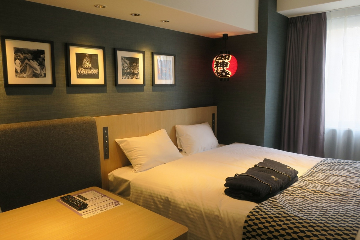 室内のインテリアはもユニーク。壁に山笠の写真が貼られ、「御神燈」の文字が入った提灯がベッドライトの代わりだったり、ハンガー掛けは神輿の棒をモチーフにしていたり、アメニティの袋もベッドカバーの柄も博多織の要素が入っていたりとご当地感に満ちています。客室だけでなく、館内随所に山笠をはじめ、地元博多色が濃く出ていて新鮮でした。