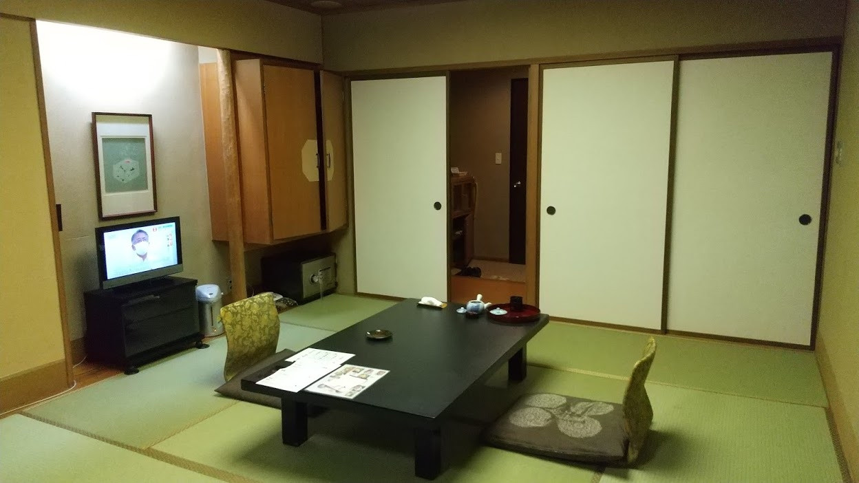 ツアーの初日に組み込まれていた旅館です。お部屋は改装したばかりのようで一見、綺麗でしたが所々畳に染みがあったり壁に穴が開いていたりしていました。アメニティが部屋にないのが残念!