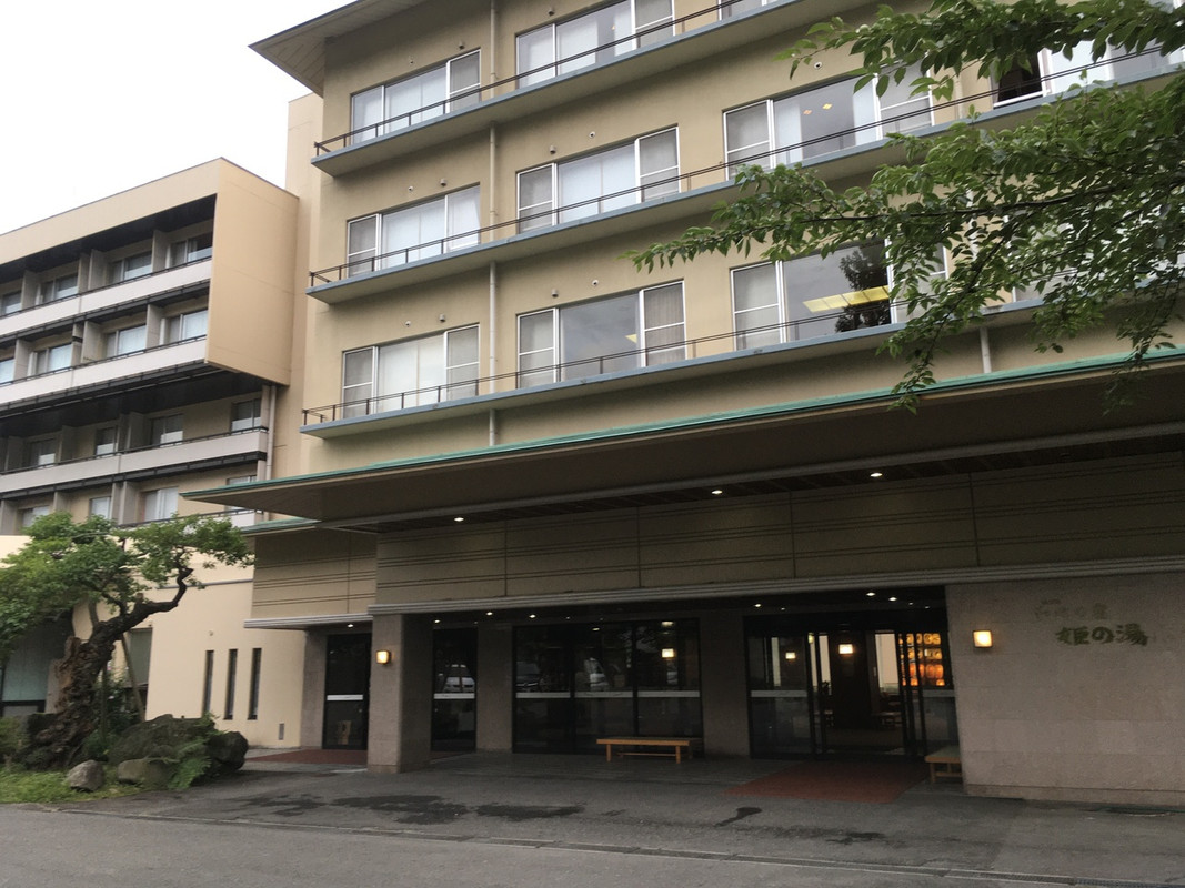人里離れた山の中の湯瀬温泉には大きなホテルが2件と小さな宿が少しあるだけの場所です。姫の湯は、駅からすぐの場所にあります。3棟からなる大型ホテルで宴会設備が充実、風呂は広く露天風呂もあり、シーズンなら観光バスがたくさん来るようですが、平日でバスは2台しか来てなかったので、閑散としていました。