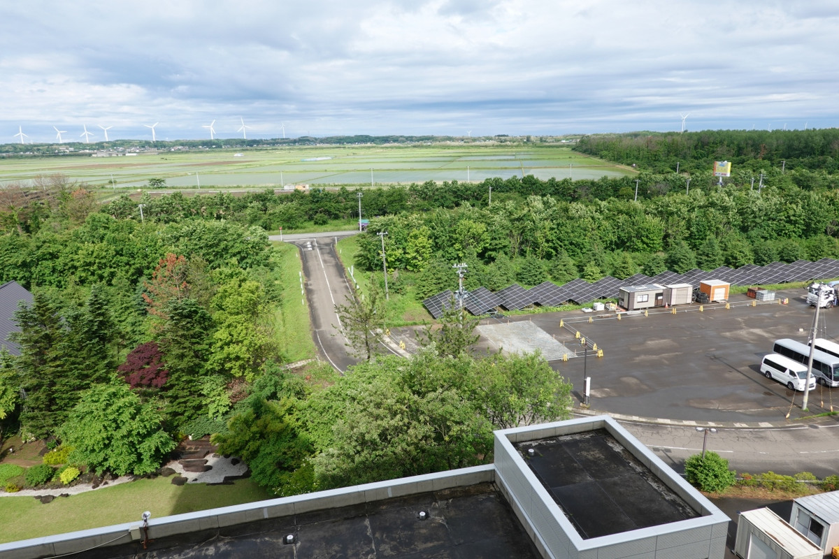 干拓地、八郎潟の中にあるホテル。周辺は農地が広がっており、最寄りのコンビニも車で5分程。逆に夜は煩くなく良い、ゆっくりしたい方には最適。最上階に展望風呂があり、その名の通り遠く白神山地まで見えて眺めは良い