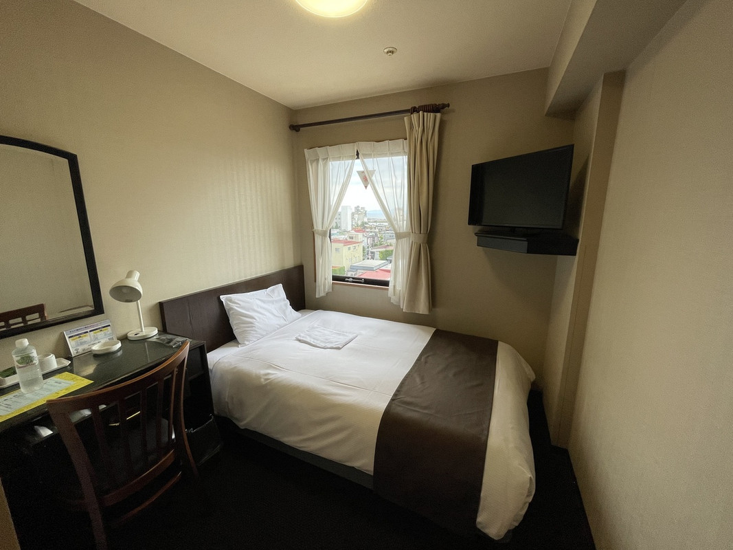 JR青森駅から歩いて15分ほどのところにあります。周囲には飲食店やコンビニがあるので特に不便は感じませんでした。宿泊したワイドシングルの部屋は狭かったが宿泊費を考えたら十分納得できるもので、清潔に管理されていて気持ちよく滞在できました。無料朝食サービスは特に珍しい物はなかったが、リンゴジュースは美味しかった。宿泊費は二人で7000円でしたが、朝食もついているしコスパが良いホテルだと思いました。