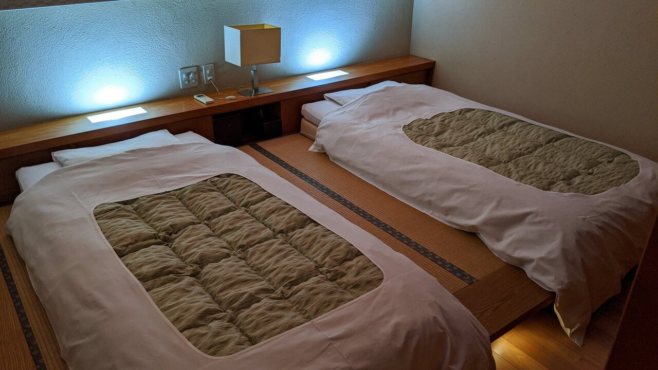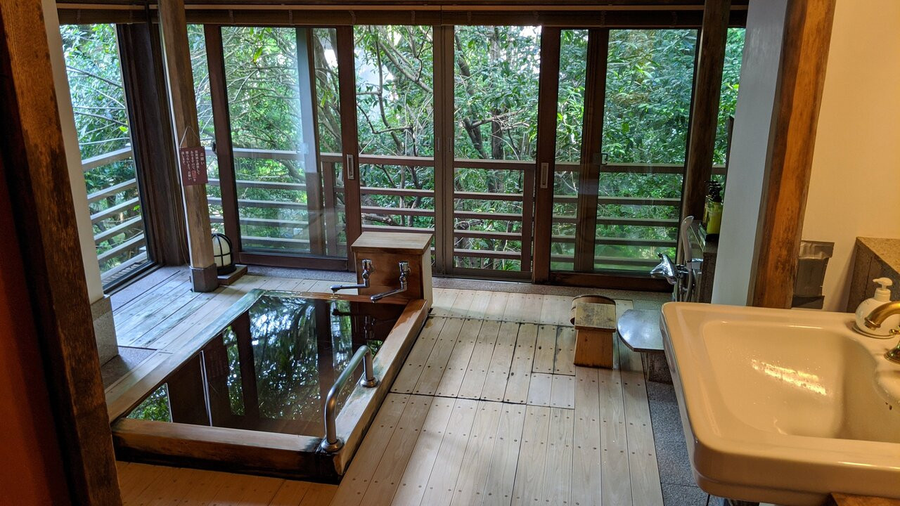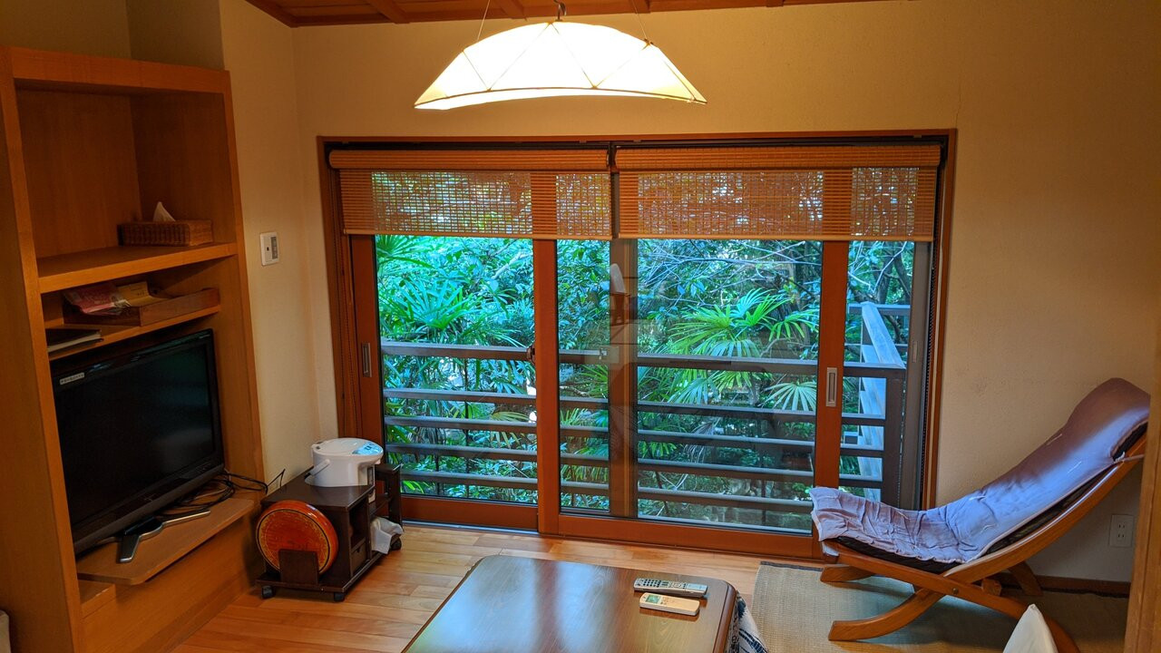 景色は良く、部屋も広々でした。部屋に付いている半露天風呂はいつでも入れるし、入った後はつるすべになりました。目の前がマックスバリュなのも便利。送迎も無料(事前予約制)です。