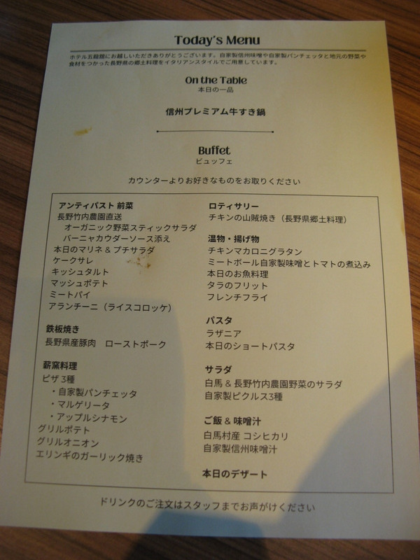 部屋は、北アルプスは見えませんでしたが、角部屋にして頂けて嬉しかったです。茶菓はありません。ロビーから北アルプスが見えるかと思ったら、ラウンジも閉められていて、食事時以外は、エレベーターホールから少し見えるだけでした。夕食は、すき焼き・わさびの小鉢・鹿肉ステーキがセットされていましたが、鹿肉は固くて、美味しくありませんでした。ハーフブッフェと朝食バイキングは、種類は少ないですが、美味しかったです。お風呂は、眺めはありませんが、小さくはなく、サウナもあって、お肌がすべすべになって、温まるお湯でした。ロビーに5種類の水がありましたが、味の違いは分かりませんでした。