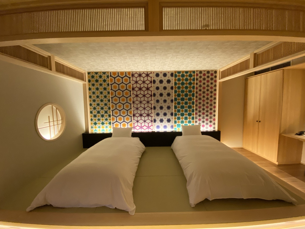 界リゾートの中の長門に行ってきました。こちらのホテル『藩主のお茶屋敷』がテーマの様です。お部屋のベットは一段高くなっており、藩主様感?出てます(笑)徳地和紙や、山内塗り、萩ガラスなど山形の工芸品があちこちに散りばめられていて、素敵でした。お夕飯時には、フグやヒレ酒など頂きとっても満足なお宿でした。