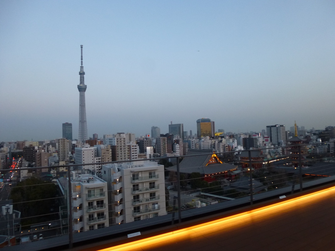 照明とベンチがあるだけの長方形のテラスなのですが、スカイツリー、浅草寺、花やしき、それにアサヒビール社のシンボルまでばっちり見えます。飲み物や食べ物の持ち込みもOKで、抑えたボリュームでかかるJAZZも良い感じでした。