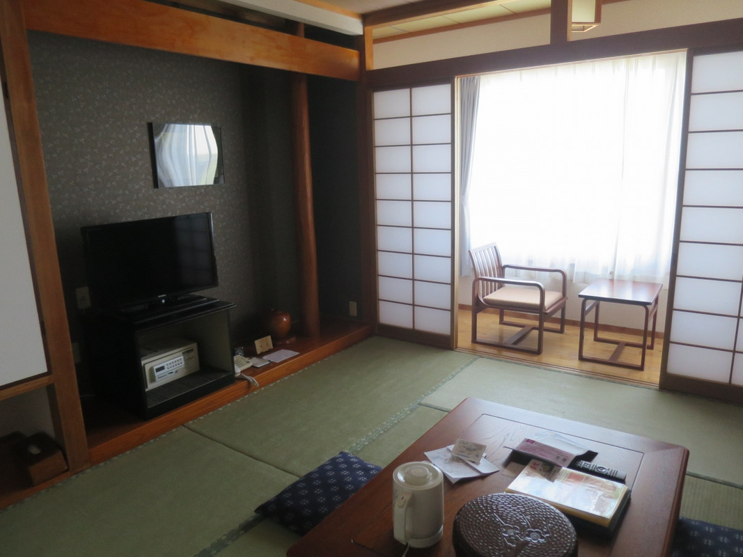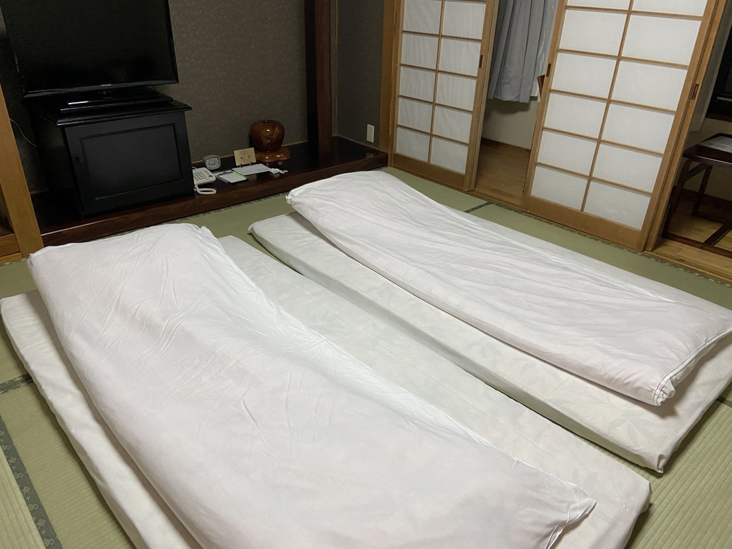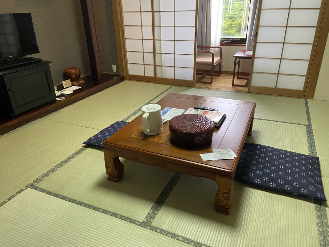 お部屋は和室。ベッドの方がいい・・と言ったら料金割増しで新館に変更できるとのことでしたが、まぁ我慢しましょうとそのまま。トレッキングの後の筋肉痛の足にはベッドの方がありがたかったけど仕方ないですね。食事に行っている間にお布団を敷いてくれるシステムでした。