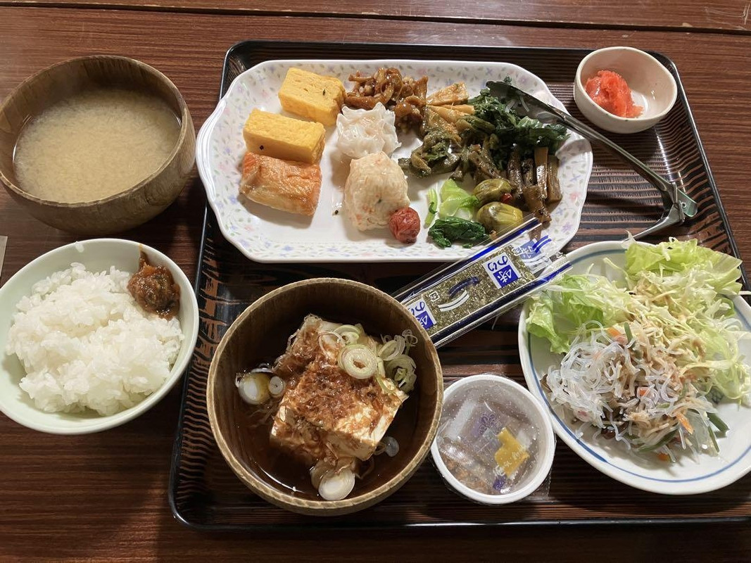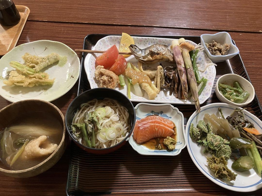 食事は朝夕ともビュッフェ形式で郷土料理から地元の山菜を使った料理などでヘルシー志向。決して豪華ではないが品数が多く、食後に頂く名水源太清水で淹れたコーヒーはとても美味しかった。