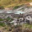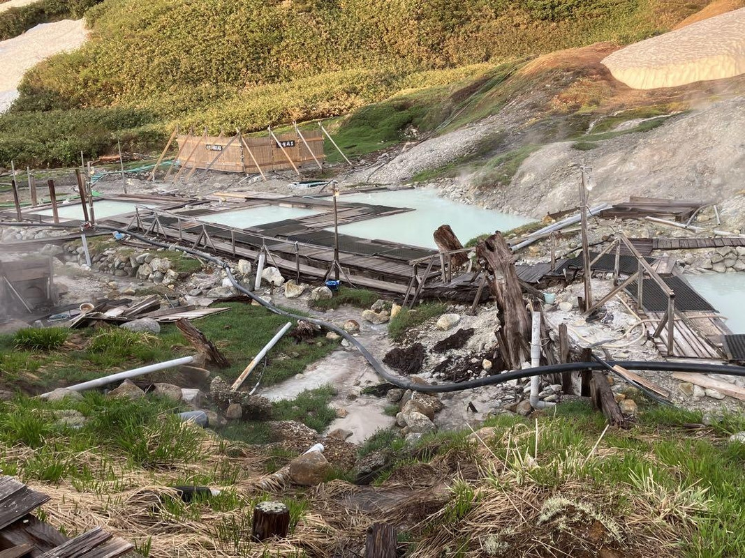 藤七温泉は蒸けの湯と並ぶ八幡平温泉郷の両横綱で「日本秘湯を守る会」に所属する。岩手県と秋田県の県境に近い標高1400mに位置し、ドラゴンアイにも近いことからシーズンには多くの宿泊客がある。八幡平の最高所に近い大自然の中の山小屋風の一軒家で、宿の横が源泉地帯になっている。源泉の上に造られた露天風呂群は、石を組み上げ周囲に渡り板を置いただけの野趣あふれる造り。周囲には硫黄臭が漂い、これまで訪れた秘湯の中でも秘湯感、ワイルド感、解放感はトップクラスだった。浴槽の下からは源泉がプクプク湧き出し、底のミネラル分豊富な泥で泥パックも出来る。
