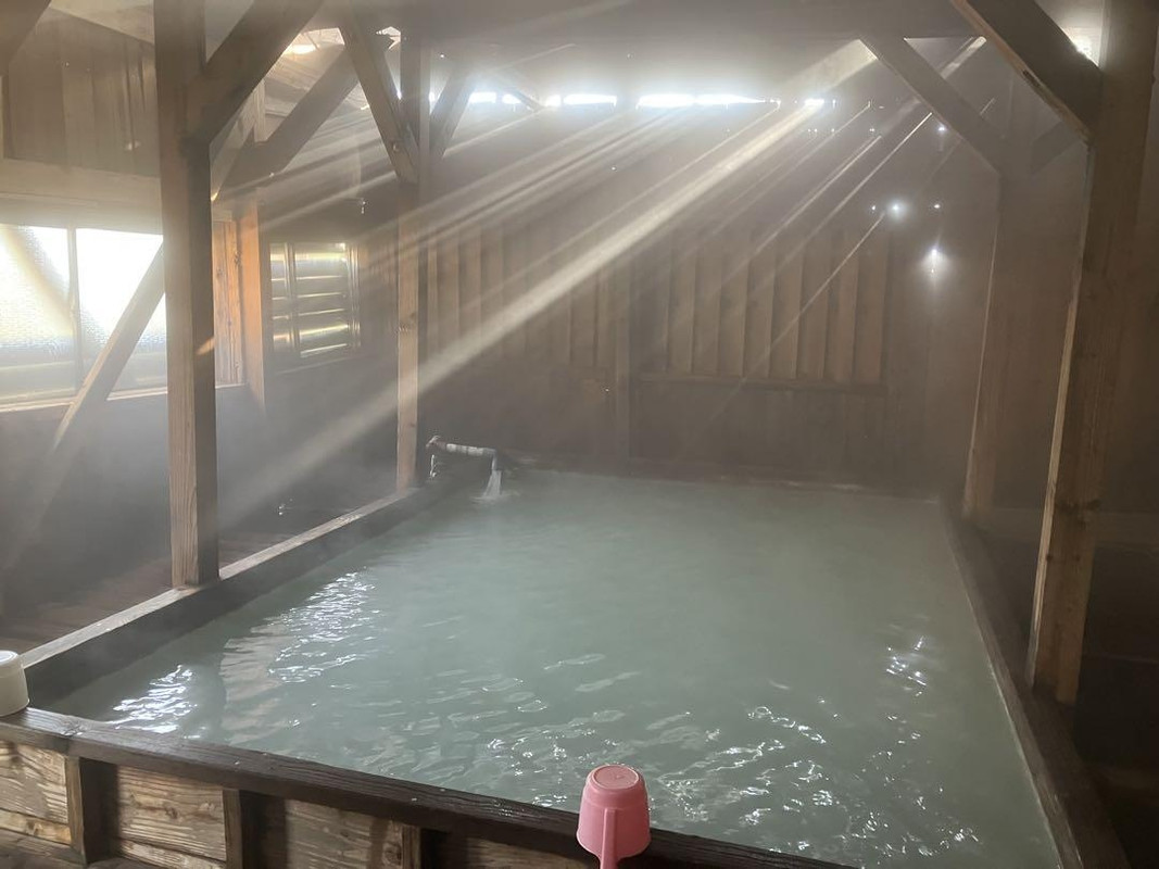 露天風呂は泡がぶくぶく沸いていて、湯舟底端にある細かい泥は、泥パックにして顔や腕に塗ると肌通夜になります。