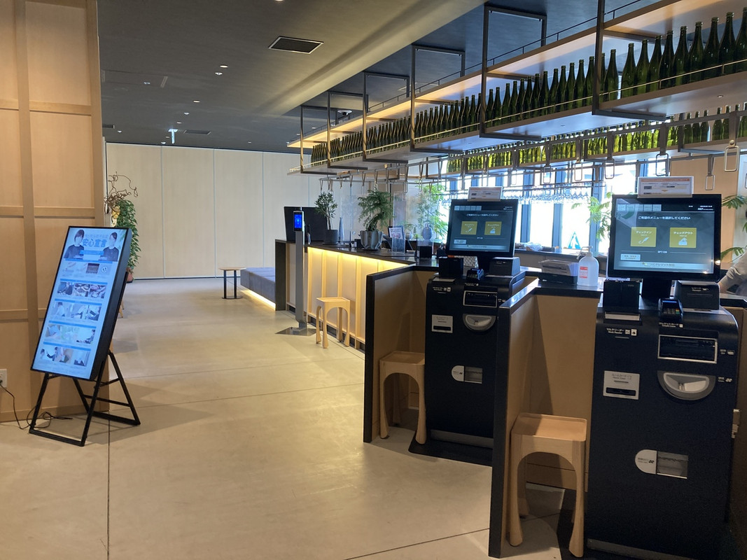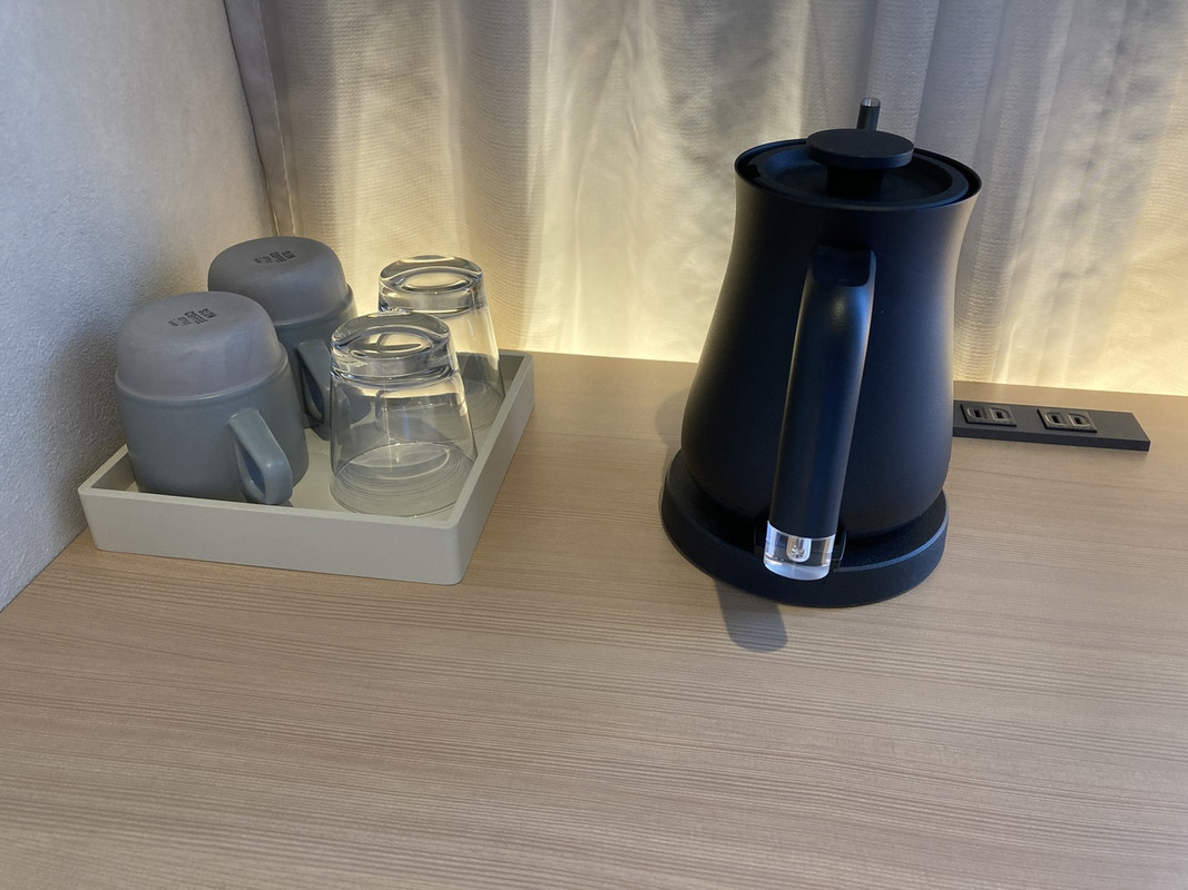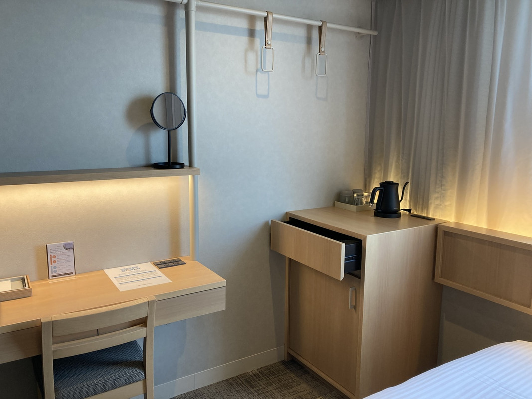 伊予鉄松山市駅・バスターミナル・いよてつ高島屋に直結したシティホテル。2021年12月にオープンした新しいホテルで、伊予鉄かオーナーで、運営をベッセルホテルが担っているよう。13階建てのホテルは1階はコンビニ(ファミマ)か入り、2階がフロント。まず、フロアの中央にある開放感のあるフロントが都会的かつ爽やか。基本的には機械でチェックイン・チェックリアウトを行いますが、フロントの方がサポートしてくれるので心配なし。制服がクレーのパーカーでカジュアル。皆同じパーカーを着ているので違和感はありませんでした。また、フロント横にはテーブルを備えたラウンジがあり、15時~24時までは、コーヒー・ソフトドリンクが飲み放題と嬉しいサービスもある。