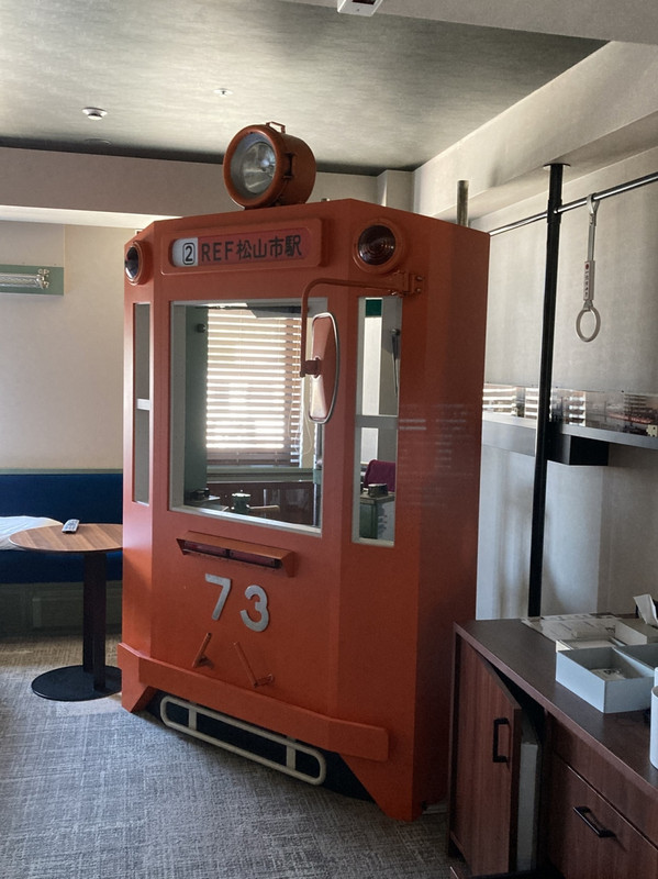 今回、たまたまおむかえの部屋が2部屋ある「伊予鉄ルーム」の一つだったので、見学させていただいた。実際に伊予鉄市内線を走っていた73号車(もう一室は74号車)の運転台や計器類、座席、吊り革、網棚、鉄道模型などが部屋に展示されています。スイッチ類は操作可能とのこと。また、運転台からは車速動画も見ることができるとのこと。是非、次回はこの部屋に泊まりたい。