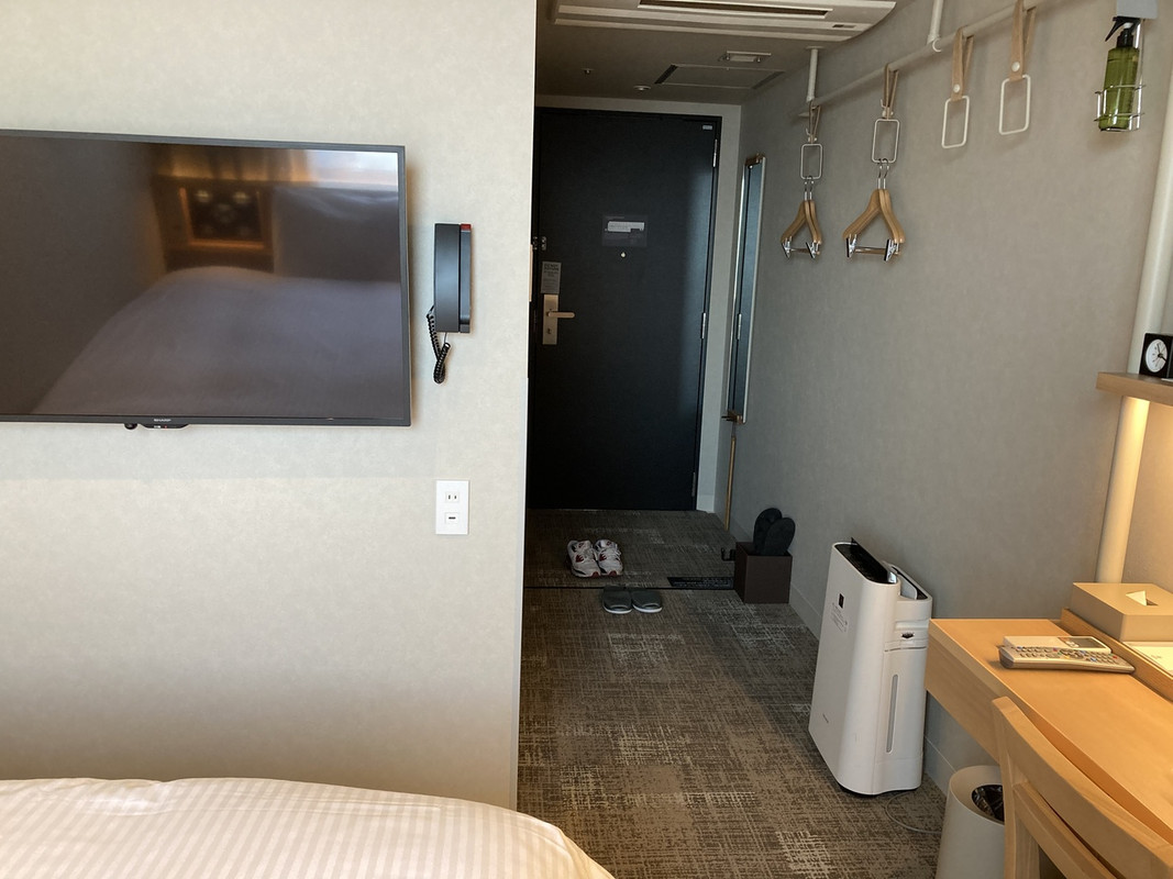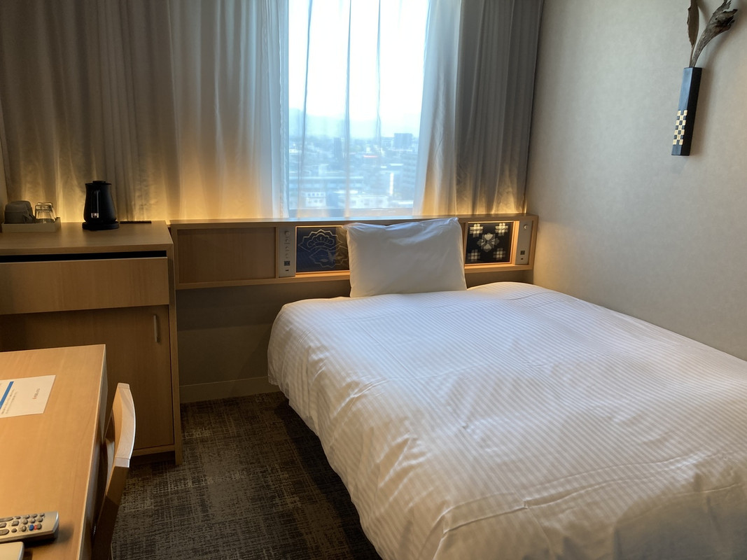 客室は全208室て、今回はスタンダードシングルルームに宿泊。部屋は靴を脱いで上がるタイプで、日本人にはありがたい。部屋の広さは約16㎡と平均的ですが、機能的にまとまっていて、しっかり机と椅子もあり、テレワークにも対応。日本三大絣の一つ「伊予絣」かあしられた部屋は豪華さを演出。また、地元の陶芸家が制作した砥別焼の花瓶が各部屋に置かれているなど愛媛を意識。