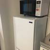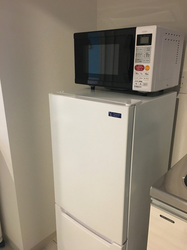 キッチンには、一通りの調理器具、食器がそろっていて、食材を買っての料理もできます。コンロはIHタイプのものが1つありました。また、冷蔵庫、電子レンジもあります。