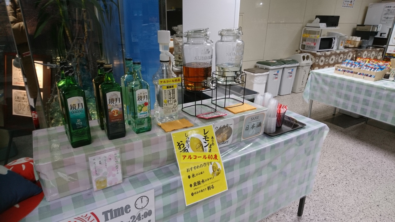 お酒も自分で自由に作れるので便利でした。うまい棒も置いてあるのでツマミに頂きました。