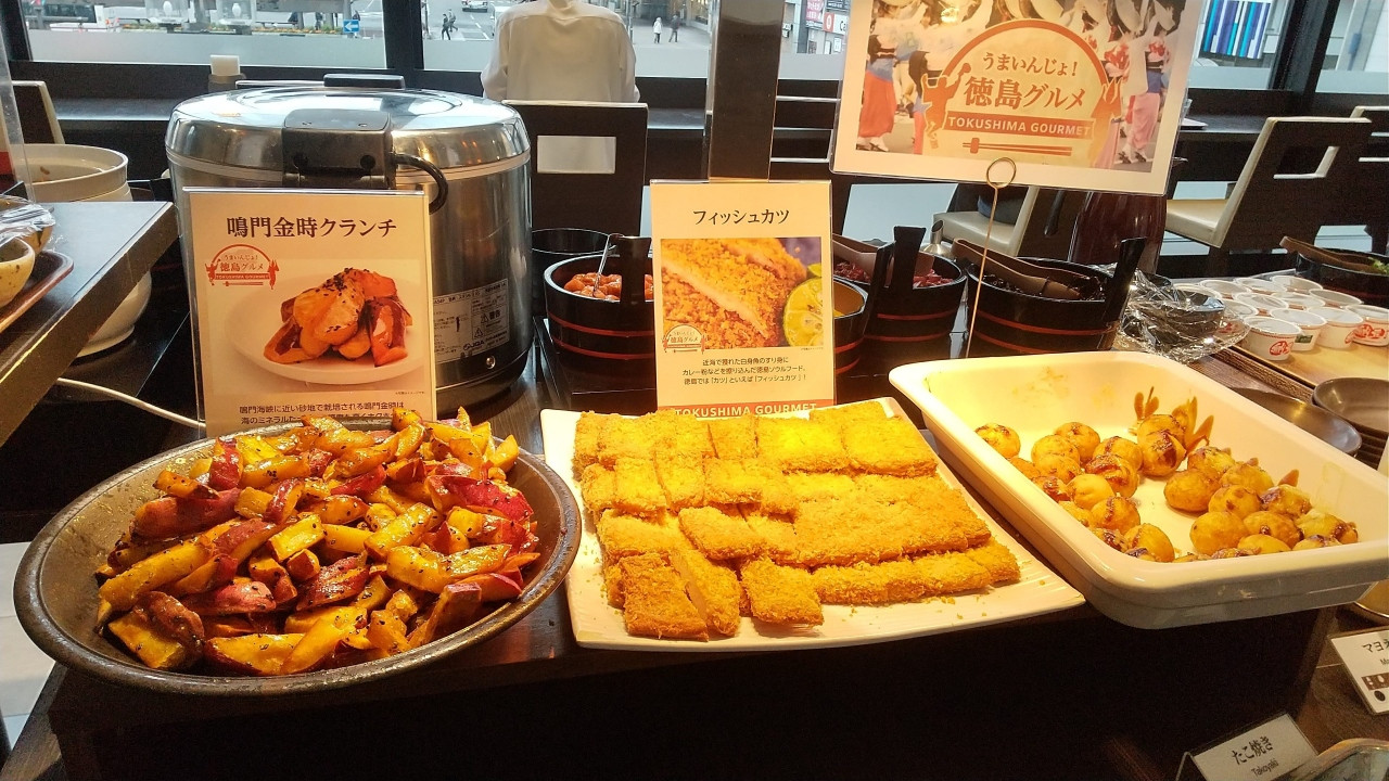 朝食は地のものはフィッシュカツと鳴門金時くらいでしたが、品数はそこそこあり、お味は良かったです。平日だったので、大き目な窓から徳島駅前を眺めながらゆっくり食べられたのが良かったかな。1 / 2