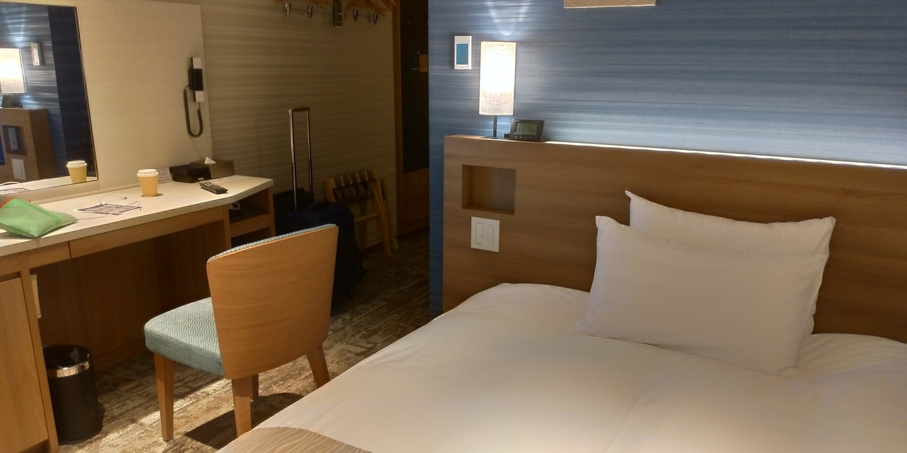 部屋は廊下が広めなので広く感じ、とても明るくてキレイ。Wi-Fiも問題ない。ベッドも広くてビジネスホテルではかなりよい居心地でした。