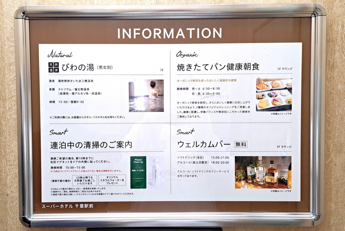 千葉駅北口から約2分の場所にあります、駅から近いので便利、ホテル周辺には飲食店、コンビニは少ないです、ホテル客室は普通のビジネスホテル並み、特徴は中浴場があり低張性弱アルカリ性高温泉(しもつま温泉)があることです、客室内の狭いお風呂より広いのでゆっくり入ることができました、到着時に無料でアルコール類、ソフトドリンクが飲めました、無料の健康朝食はいいです、そこそこの種類の料理がありました、麻婆豆腐や焼売がありました。