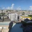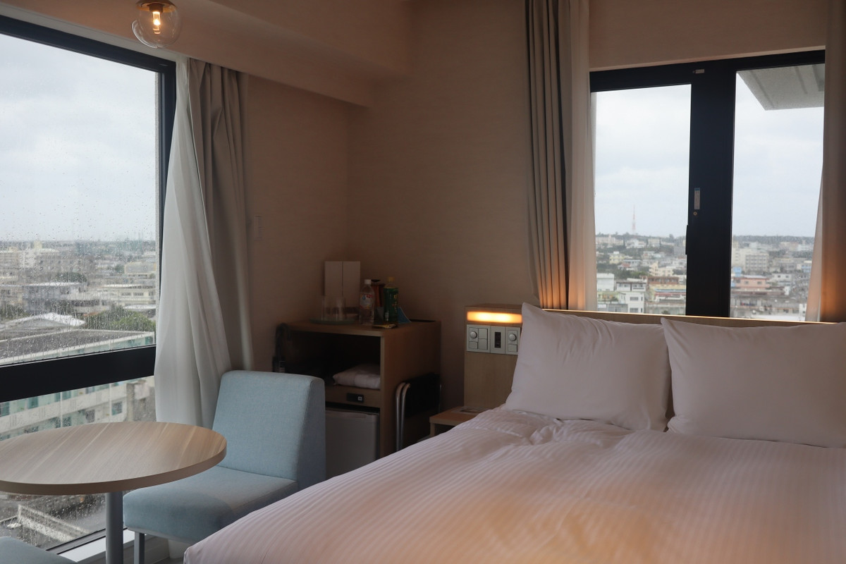 宮古島に2021年6月25日オープンした新しいシティビジネスホテルです。チェックイン時刻は15:00ですが、ライン会員になると14:00チェックインが可能になります。お部屋が高層階だと市内と伊良部大橋が一望でき、コーナーにしたので二方向の眺望が楽しめました。
