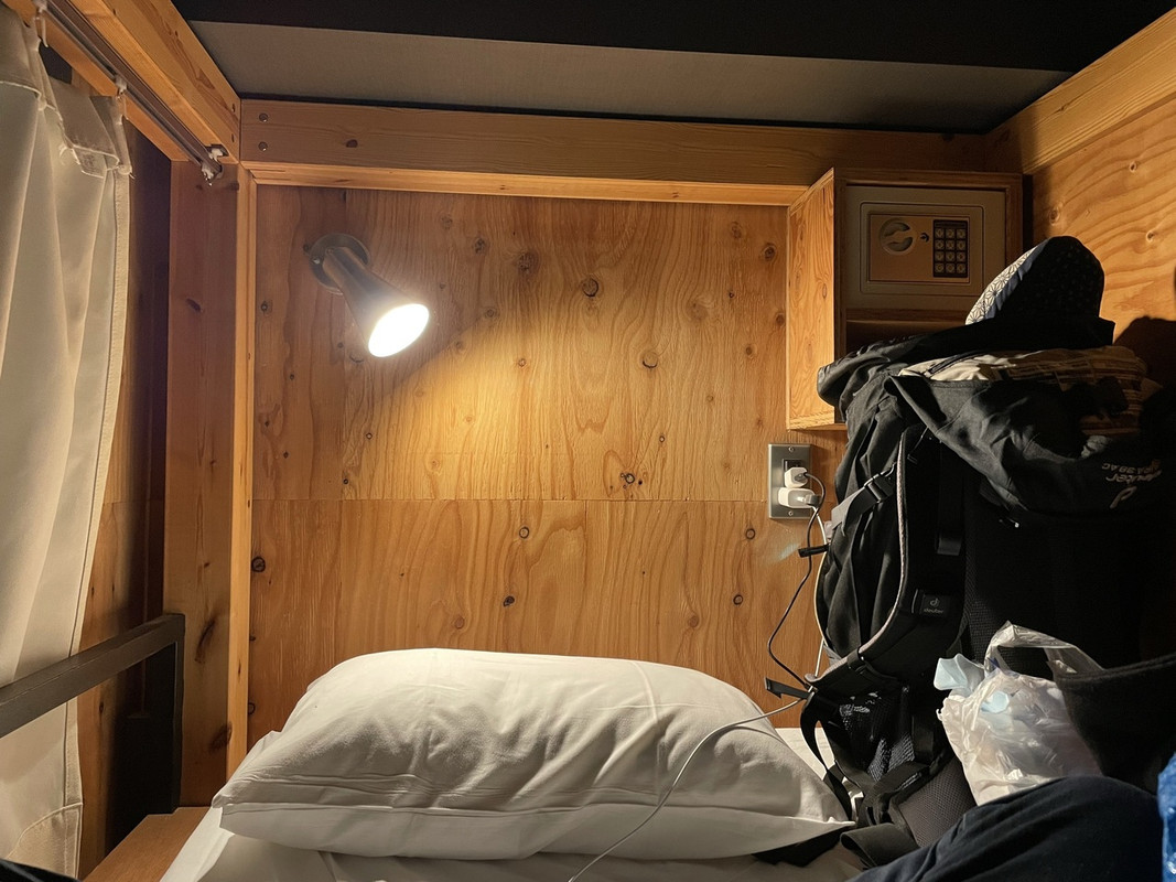 浅草観光をした翌朝、羽田空港国際線ターミナルへ行く必要があり利用しました。1階はカフェのようになっていて居心地いい感じでした。部屋はベニヤ板感のある二段ベッドでカーテンで仕切られていました。部屋は狭く大きな荷物を置いたり出し入れは大変かもです。利便性と値段と新しめを考慮すると妥当かなと思います。