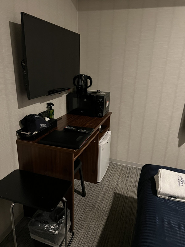 トイレとお風呂が独立しているのはいいですね。周囲には24時間営業のスーパーもあって便利でした。ただ6泊以下は清掃はなし、清掃リクエストの場合は1000円かかるとのこと。最近は連泊するときは清掃しない、あるいは客側から不要のリクエストがあれば部屋には入らない・・などというホテルも増えてきましたが、さすがに6泊まで清掃しないというのは、ホテルの仕事を放棄しているようにしか思えないというか・・。