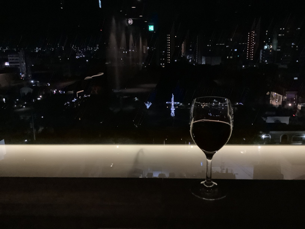 宿泊客は一杯フリードリンク付き。10Fのラウンジが利用できる。10Fなので夜景がきれい。このラウンジは朝は朝食会場になる。