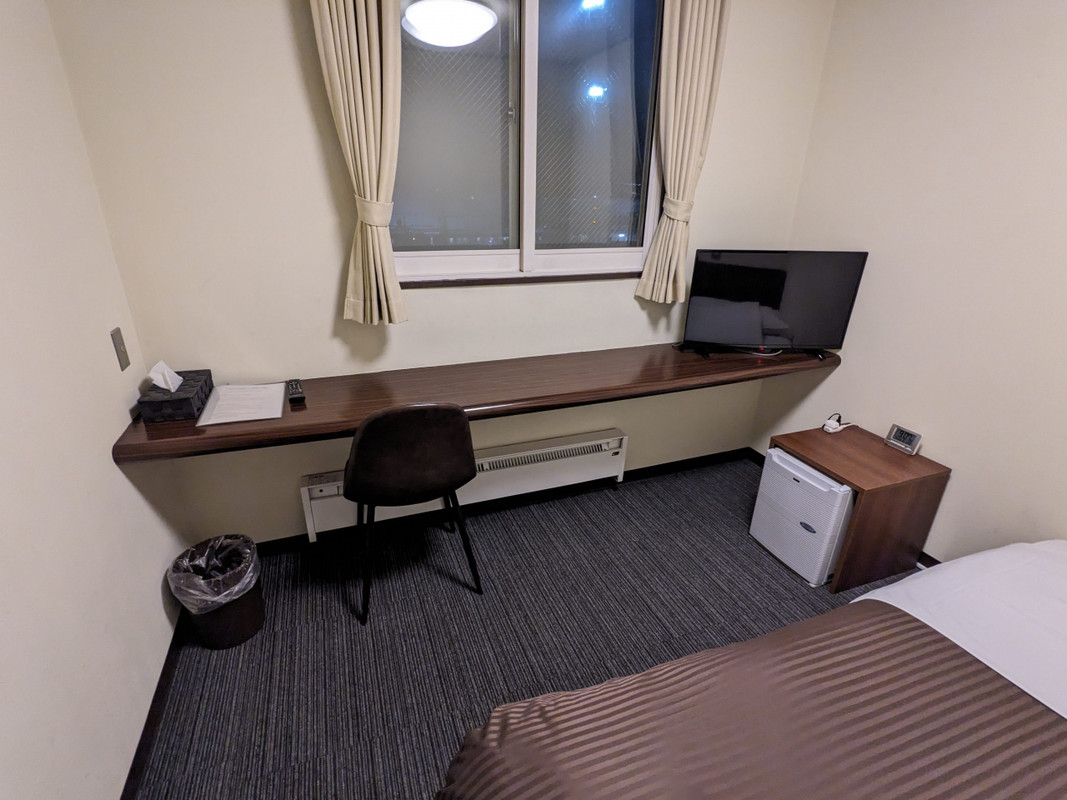 網走駅前に大手チェーンホテルがふたつ並んでいますが、こちらは線路沿いで道路を渡りません。地元系のビジネスホテルです。フロント氏はホスピタリティある対応でした。線路側の部屋ですと、網走駅に発着する列車をいながらにして眺めることができます。設備は古いですが、整っており、不自由はなく、リーズナブルに利用できます。