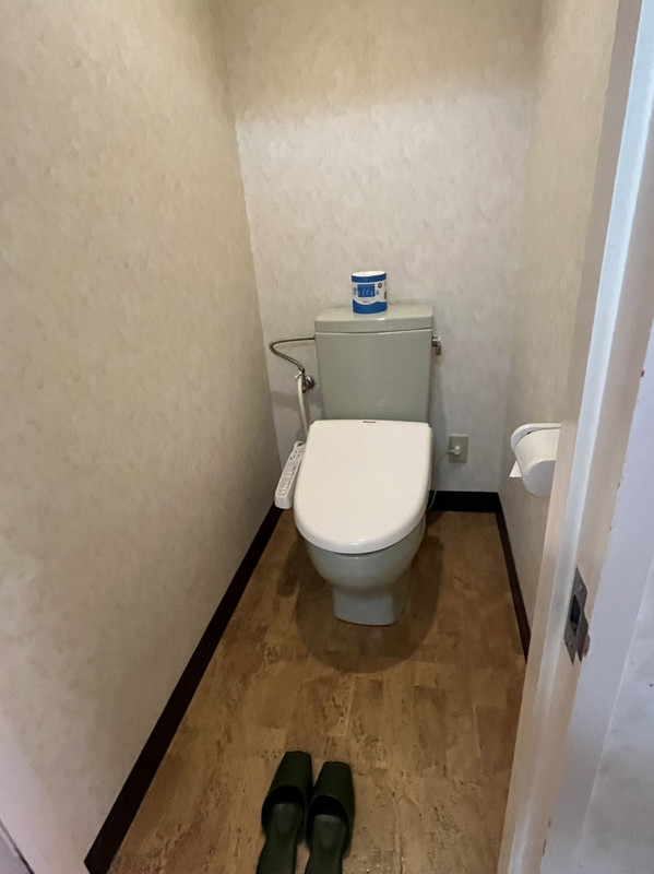トイレの壁には他の宿と同様にシミが点々。木の角の塗装には剥れ。便座は水流の強さ等調節できないようにしているようだ。