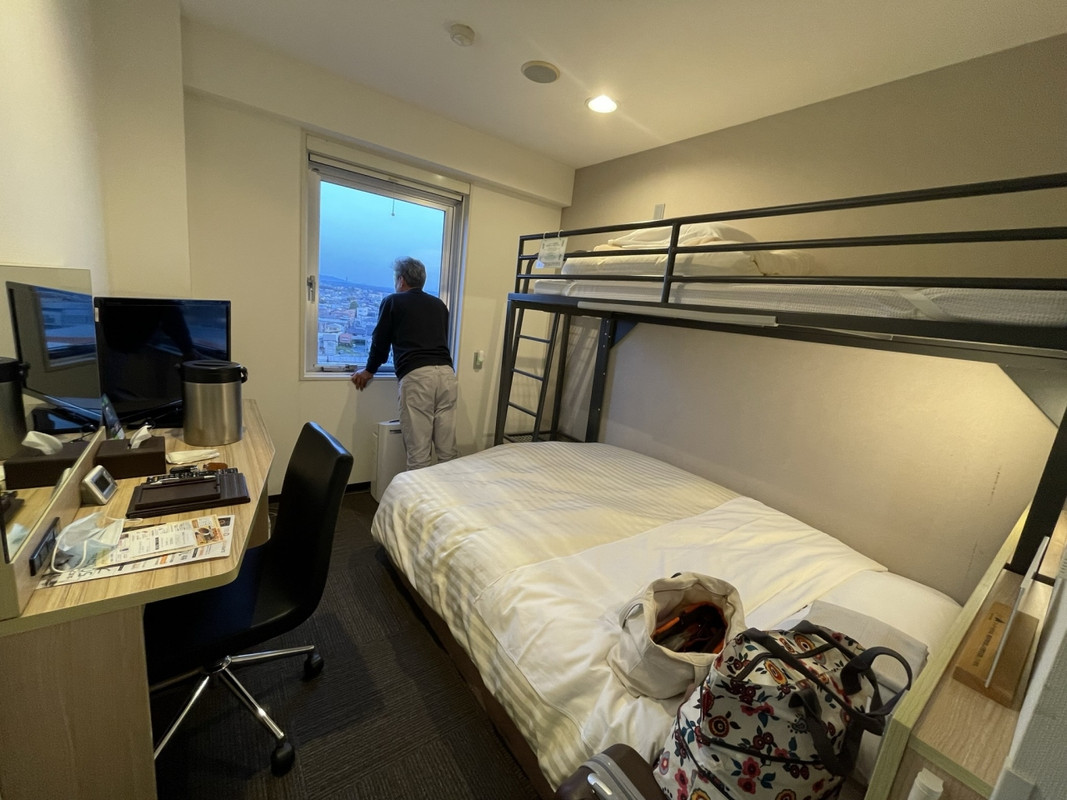 スーパールームに二人で宿泊。部屋もバスルームも狭いです。狭いのにテレビ前に背もたれ付きの椅子があるので余計に狭く、人がすれ違う事さえ厳しい。椅子はじゃまなので入口に移動させました。上のベッドメイクは自分でしなくてはいけません。