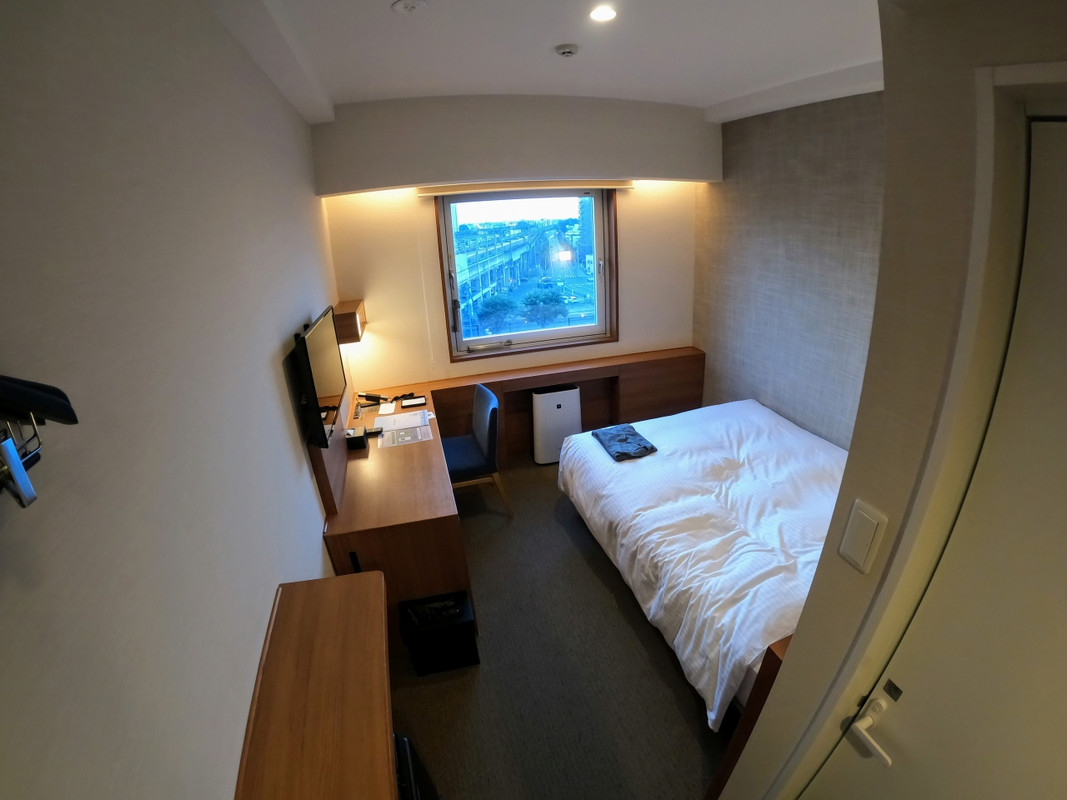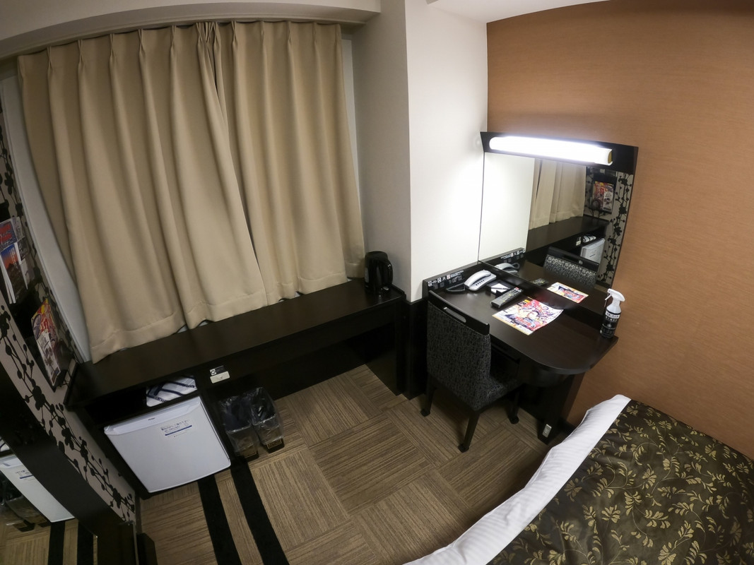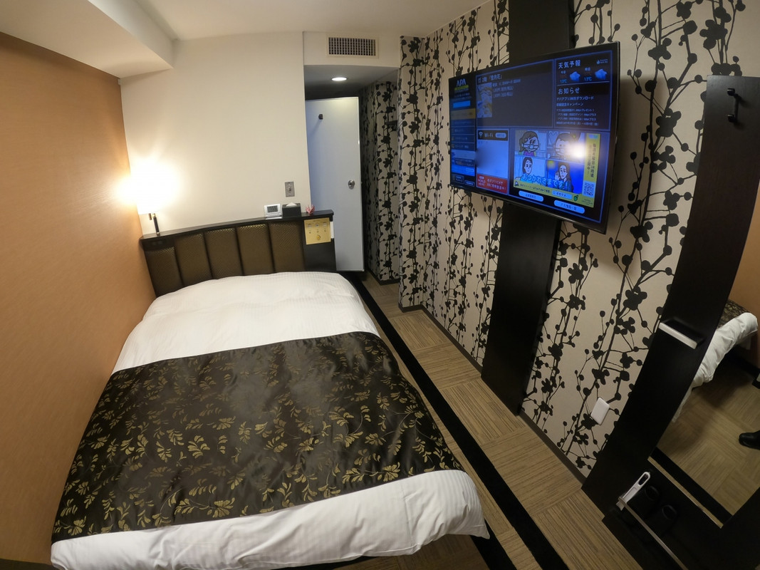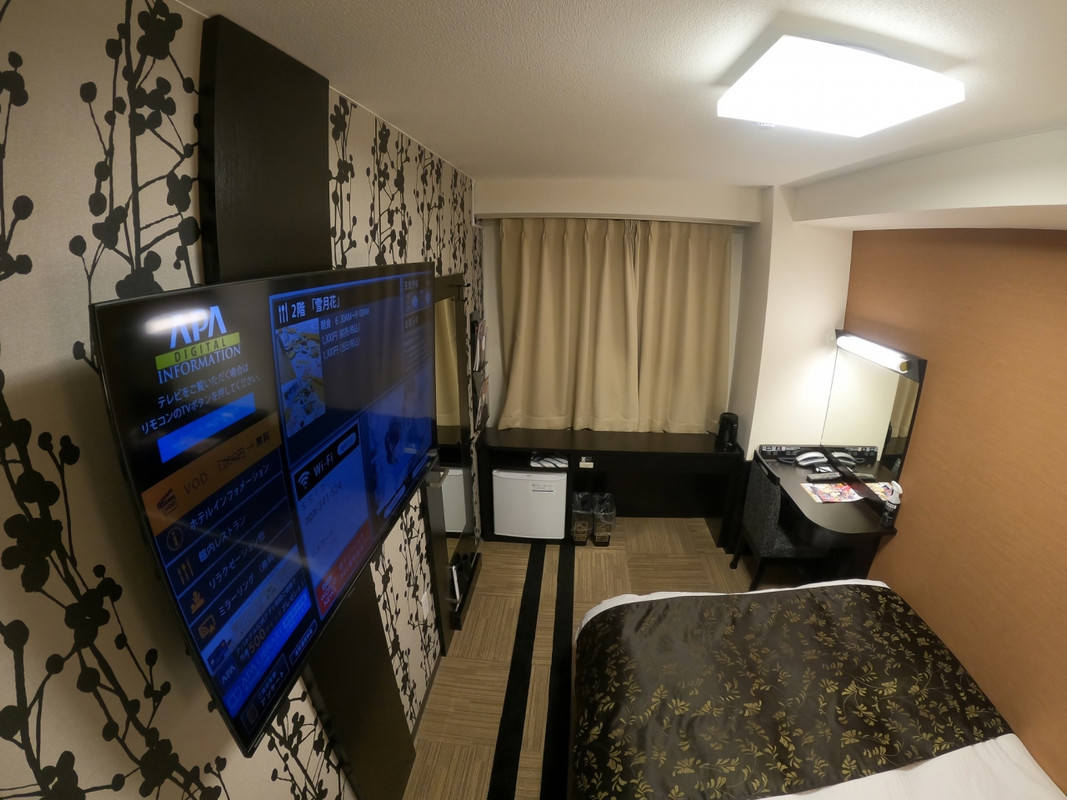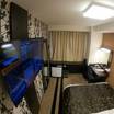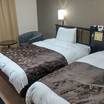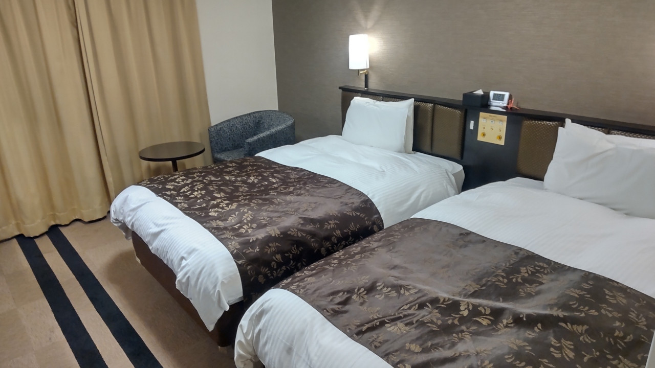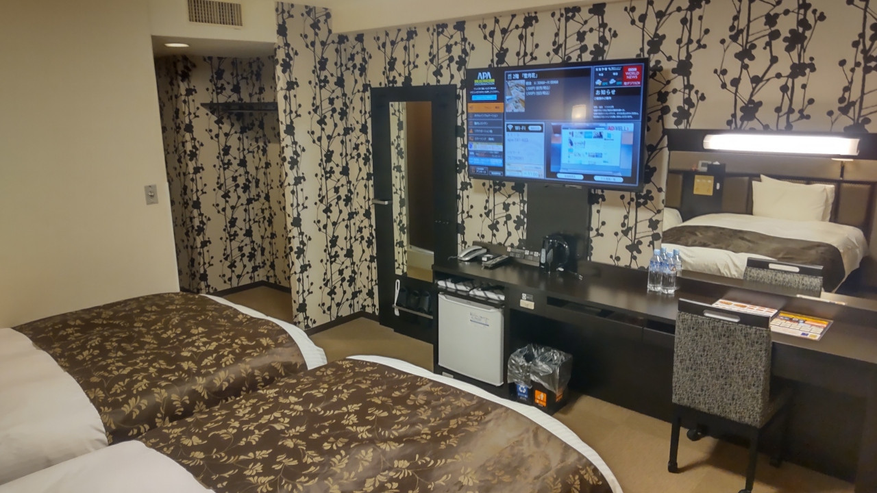 ロビー、フロントが広い、地方アパならではの趣。ツインに泊まったが部屋が広くベットは大きめでフカフカ、テレビも大きく、壁際のデスクからは見にくかったが、不自由はなかった。