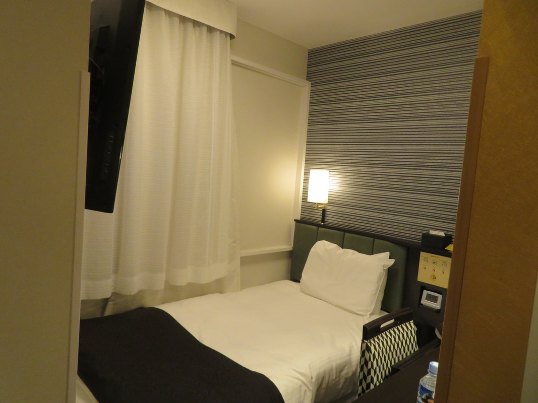 アパホテルは全体的に狭いと思ってたのですか。ここのアパはこれまでで一番狭かったかも。ベッドとディスクの間はやっと歩けるほどしかなく、ディスクの椅子をちゃんと出して座るのも大変です。なのに入口横にはスキーやスノーボードでも置くのかという荷物置き場のようなものが。昔は違うホテルだったので改装したからなのか。作りが意味不明で笑ってしまうほどでした。立地もよいし、コンビニにも1Fにあってよいのですが部屋がどうにも無理でした。