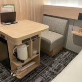 机や椅子は貧弱で最小限何故か冷蔵庫は窓際の変なところに置かれている、ポットやお茶のセットもなしなどなど。ベッドの上以外に居場所がないというのが正直なところです。