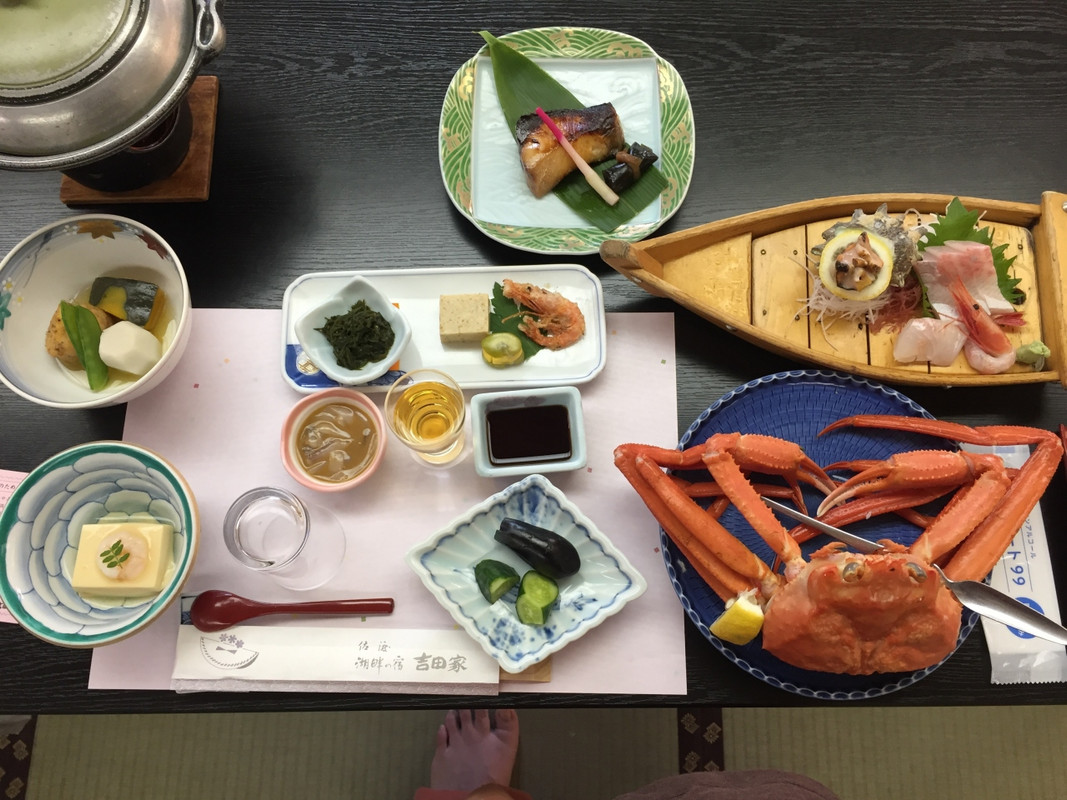 夕食カニが1人1杯つくのはびっくりしました。いろいろなものが少しづつって感じのご飯でした。佐渡名物の柿のシャーベットが美味しかった。