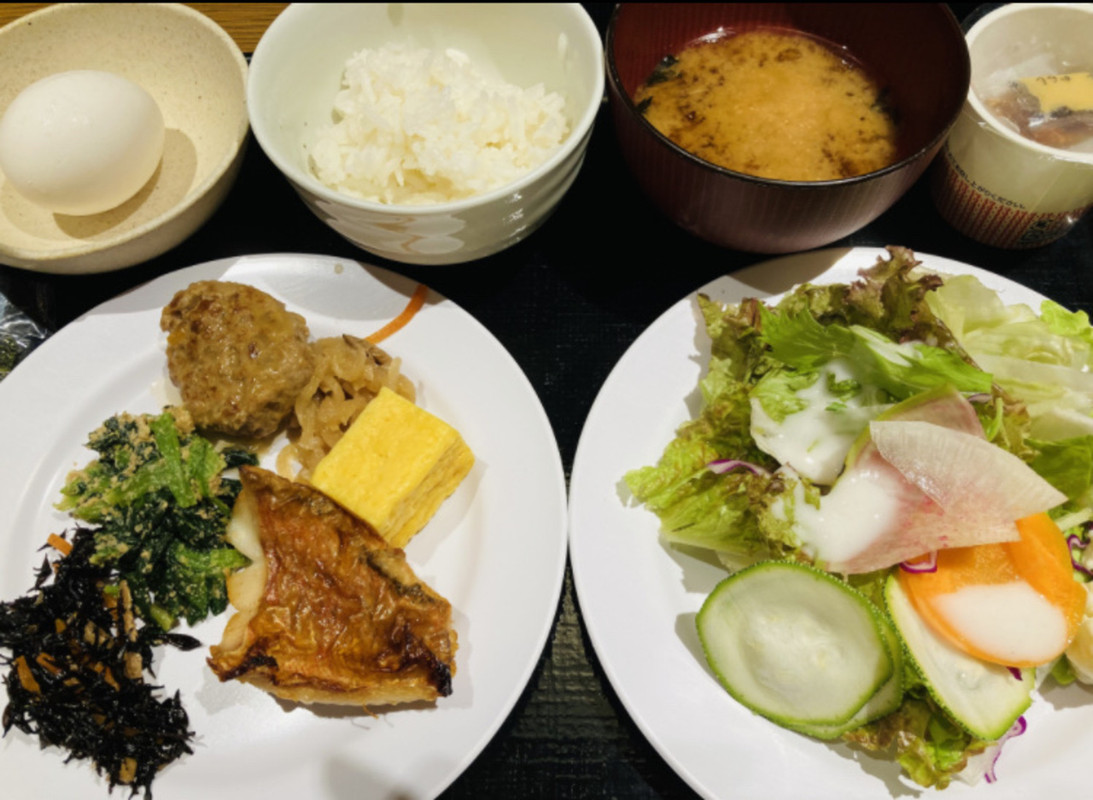 朝食はそれなりに値段がかかるが品数も多くおいしい。特にサラダは数種類の野菜が入っててよかった。1 / 2
