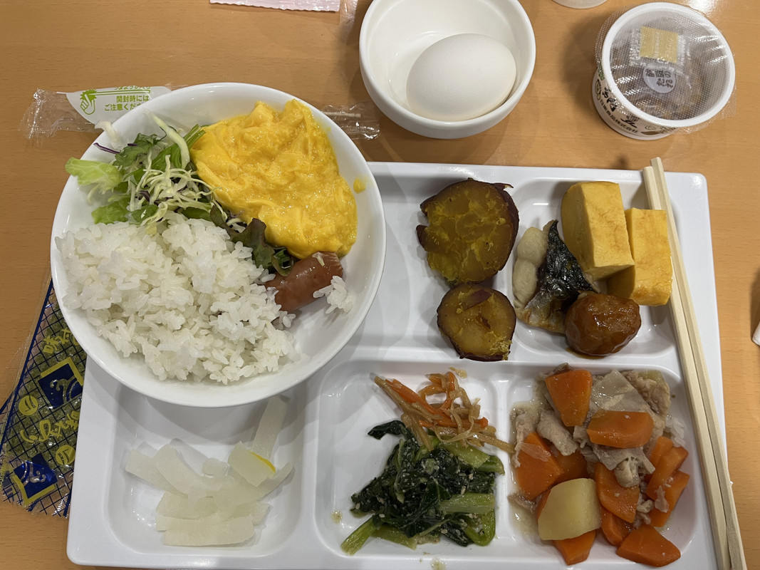 朝食はコロナ対策で、1階の食堂からお弁当パックに自分で詰めて、自室内で食べました。1 / 2